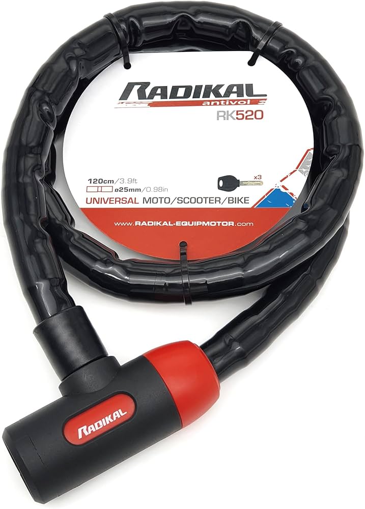 Il cavo snodato RK520 è costituito da boccole e sfere in metallo ø25 unite tra loro. Il lucchetto è consigliato per mettere in sicurezza biciclette/moto/scooter in luoghi a medio rischio di furto. Design universale, adatto per bicicletta, scooter e moto in una zona a rischio di furto basso. È ricoperto da una copertura in PVC, per evitare spiacevoli attriti sul veicolo. Envíos gratis en el día Compra online de manera segura con Compra Protegida © Radikal Rk520 Cadena Piton Moto Candado Antirrobo Bici La dimensione di questo antifurto è di circa 120 cm Il sistema di chiusura a catena articolato è a pressione, basterà spingere il giunto della catena per mettere in sicurezza il vostro veicolo, rendendolo comodo e facile da usare. Catena Bicicletta Antifurto RADIKAL RK72 Lucchetto Antifurto Moto Mini U, Doppia Sicurezza E Doppia Funzione Per Disco O Lucchetto Casco Moto Ulteriori informazioni sul prodotto. Sono incluse 3 chiavi di sicurezza. È possibile chiuderlo senza chiave grazie al sistema click inserendo l'estremità nella parte di blocco. La catena di sicurezza per moto o bici è composta da sfere e boccole in acciaio corazzate da 25 mm che rendono la catena flessibile e resistente. Il cavo ha anche un rivestimento esterno in PVC che impedisce danni alla superficie del veicolo. Il corpo di chiusura può ruotare di 360 gradi su se stesso, rendendo più comodo il passaggio di chiusura della catena. Il suo peso davvero leggero lo rende uno degli antifurto più comodi da trasportare.