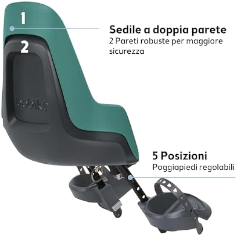 Progettato nei Paesi Bassi e prodotto in Portogallo. Testato nel centro prove Bobike per una doppia sicurezza. Chiusura di sicurezza a prova di bambino. È disponibile un adattatore A-Head che richiede solo 4 mm di spazio. Permette un facile trasferimento del seggiolino tra biciclette. Bobike GO Mini è un seggiolino di sicurezza per bambini da montare anteriormente sulla bicicletta. Con Bobike GO Mini, potrete esplorare la città insieme al vostro bambino in modo sicuro e unico in bicicletta. Partite per la vostra prossima avventura urba Lunghezza minima del tubo sella richiesta: 35 mm. Il guscio protettivo extra esteso offre una protezione ottimale nei paesi in cui le piste ciclabili separate non sono la norma. Premiato con il marchio di qualità EQTM European Quality Trademark. COMFORT: Cuscino impermeabile, confortevole e removibile per una facile pulizia. MONTAGGIO: Compatibile con tubi di sterzo standard Ø 22-32 mm e tubi di sterzo MTB 1-1/8”. Il Bobike Go è disponibile in 6 bellissime tonalità pastello. Seggiolino Bici BOBIKE 8012500003 - GO MINI Seggiolino Anteriore Da Bicicletta Al Telaio – Sicuro & Compatto Per Bambini Da 9 Mesi A 3 Anni Fino A 15 Kg, Marshmallow Mint Bicicletta Bambina 3 Anni Compatibile con un parabrezza abbinato. DESIGN: Design elegante, compatto ed ergonomico per una maggiore maneggevolezza e facilità d’uso. Cintura di sicurezza a 3 punti con spallacci regolabili.