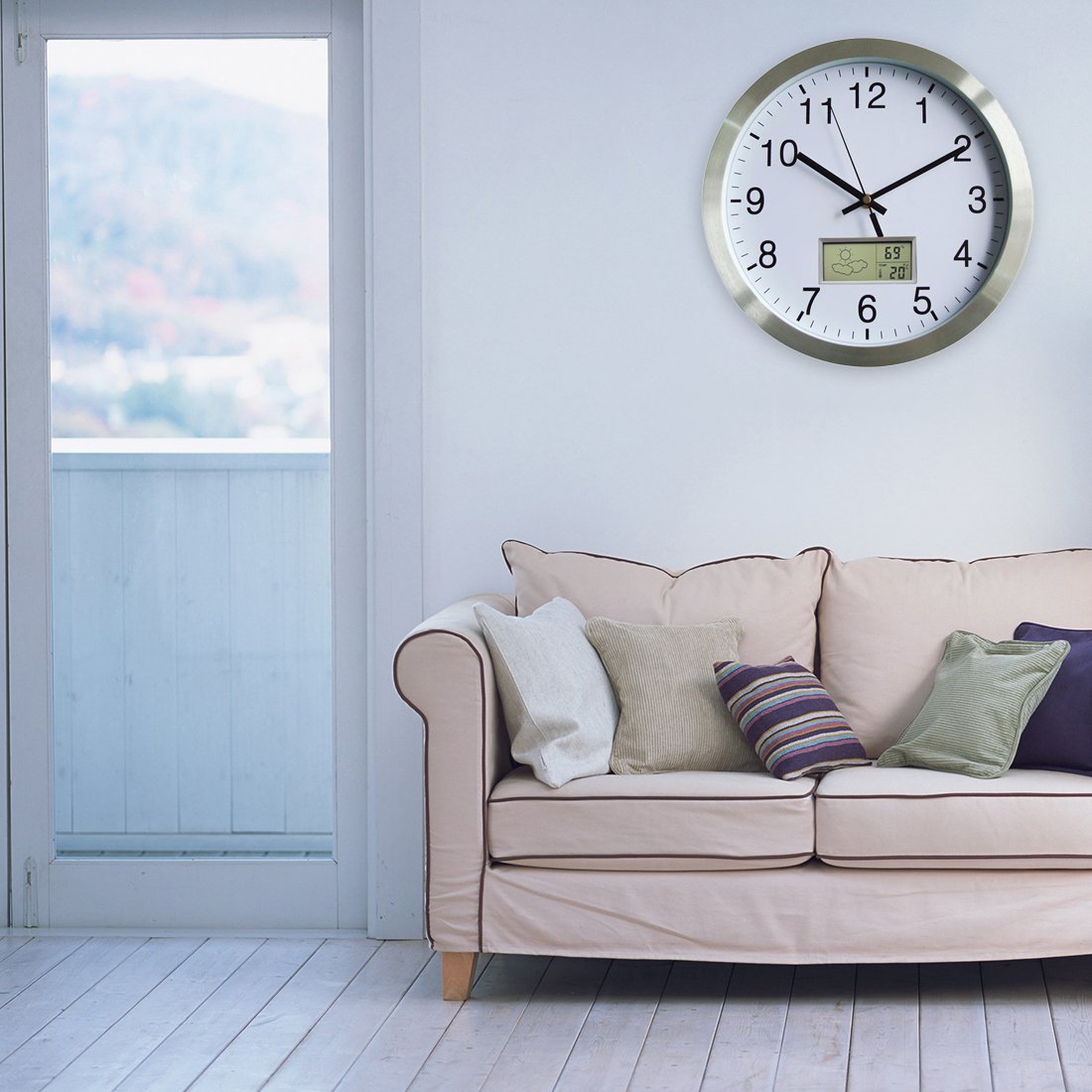 Il bordo di questo orologio da parete è in metallo? Sì, il bordo dell'orologio da parete è realizzato in alluminio metallico e sembra molto elegante. La sua attrattiva universale lo rende un regalo fantastico per familiari e amici e aggiunge un tocco di eleganza e funzionalità a qualsiasi ambiente. Le tre lancette inizieranno a muoversi una dopo l'altra. Alimentazione: 3x batterie AA (LR6) da 1,5 V (per l’unità principale); 2x batterie AAA (LR03) da 1,5 V per il sensore esterno. Portata di trasmissione: 30 metri. Campo di temperatura: Da -10 a +50 °C (per la temperatura interna); da -20 a +60 °C (per la temperatura esterna 【Orologio da parete radiocontrollato silenzioso】Orologio da parete radiocontrollato silenzioso, senza ticchettio, grandi numeri e buona visibilità, perfetto per soggiorno, cucina, ufficio e camera da letto. Questa orologio da parete è veramente silenzioso? Sì, molto silenzioso. Orologio Da Parete Con Temperatura Maison Exclusive - Orologio A Parete Radiocontrollato Al Quarzo 31cm Bianco E Nero 88165678 Orologio Da Cucina 【Design moderno dell'orologio da parete】Con il suo design contemporaneo ed elegante, questo orologio è ideale per diverse stanze, come orologio da cucina, orologio da parete silenzioso per soggiorno, camera da letto, ufficio, bagno. Non influisce sul sonno o sul lavoro nella tua camera da letto o nel tuo studio. Dopo aver ricevuto il segnale, le lancette si posizionano automaticamente nella posizione corretta per iniziare a funzionare. La sua fonte di alimentazione indipendente garantisce una durata e prestazioni costanti a lungo termine. 【Orologio da parete radiocontrollato con indicatore di temperatura e umidità】A differenza di altri orologi da parete, questo orologio ha un indicatore di temperatura e umidità.