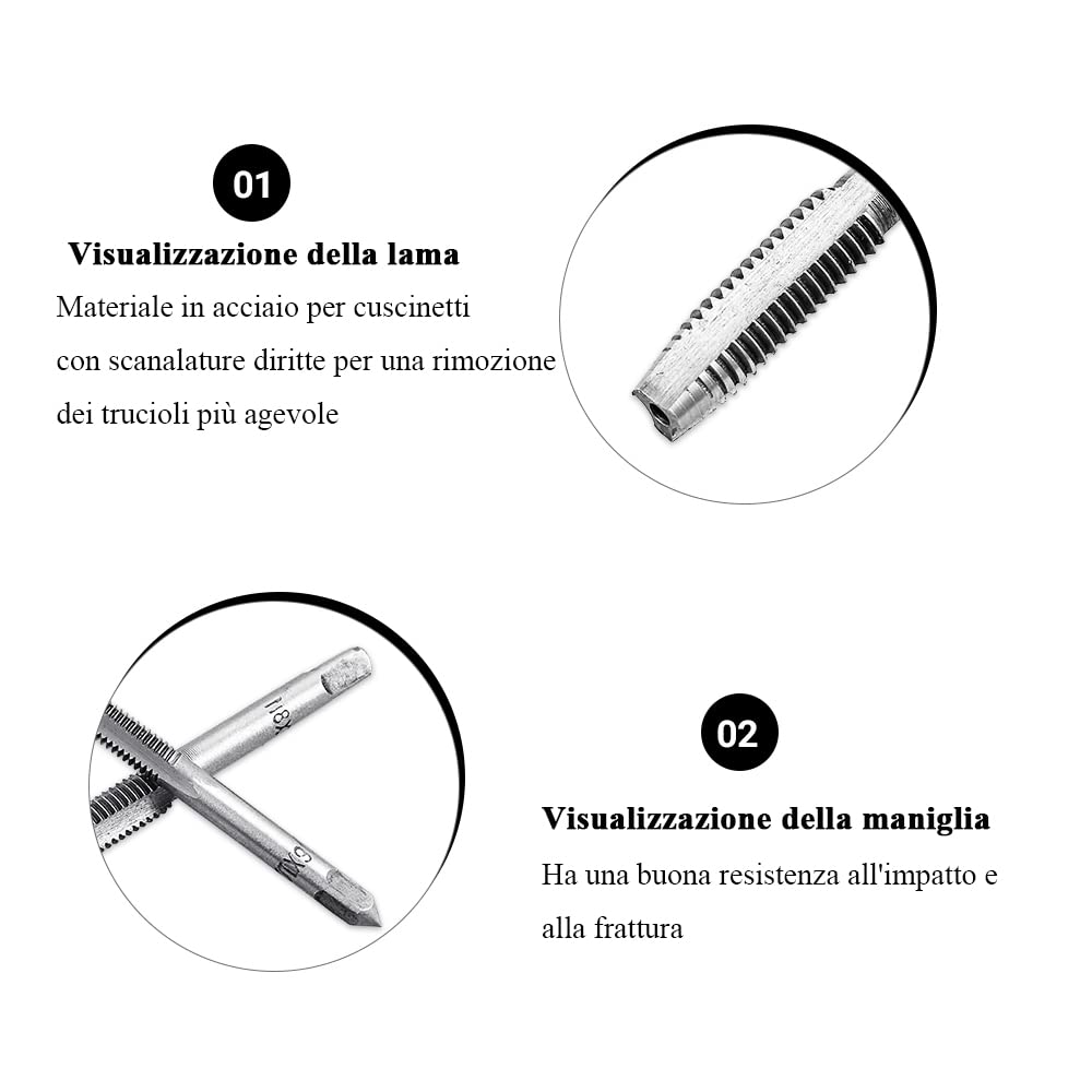 Materiali: la filettatura è realizzata in acciaio ad alta velocità, l'impugnatura è realizzata in acciaio per cuscinetti di alta qualità e il mandrino è realizzato in acciaio legato che è resistente. Cosa c'è nella scatola? ● 1 set di cacciaviti con impugnatura a T - argento. Giramaschi Per Filettatura Maschi Filettatura Fixinus Set Di 6 Maschi Per Filettatura Manuale HSS, M3 M4 M5 M6 M8 Con Impugnatura A T Regolabile, Strumento Per Filettare Verricello Manuale Giramaschi Filettatura Manuale Caratteristiche del prodotto: ● Materiale: acciaio ad alta velocità. ● Colore: argento. ● Peso della confezione: 250 g. svolge un ruolo importante nella manutenzione e nella riparazione quotidiana. Dado zigrinato per il serraggio. La chiave a cricchetto a forma di 304772417756 SET CHIAVE A Cricchetto Professionale Giramaschi per Filettare con Impugnatura T - EUR 24,90 ● Dimensioni del prodotto: 8,6 x 10 cm. ● Dimensioni della confezione: 19 x 14,5 x 2,2 cm. 5 dimensioni: per rubinetti con filettatura M3-M8. Dimensioni della testa della vite: M3 x 0,5, M4 x 0,7, M5 x 0,8, M6 x 1,0, M8 x 1,25. Design: strumento meccanico regolabile per il taglio del filo a forma di T, può essere azionato con una sola mano, facile da usare.