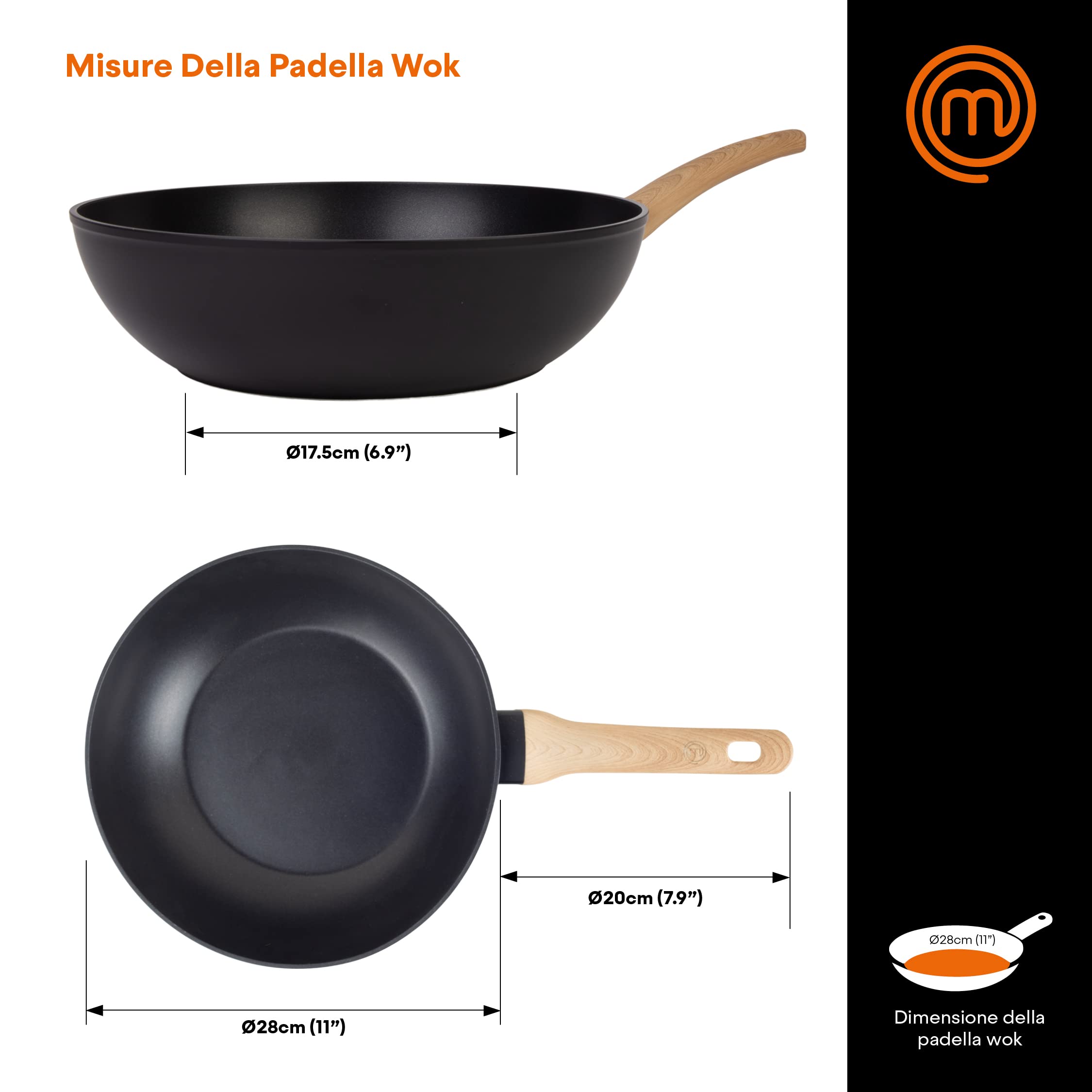 Compra MasterChef Padella Antiaderente 28 cm, Pentole Induzione, Padelle Alluminio per Friggere, Frittata, Salta, Uova e altro, Antigraffio, Adatta a tutti i Piani, Lavabile in Lavastoviglie, Nera. SPEDIZIONE GRATUITA su ordini idonei OTTIMA DISTRIBUZIONE DEL CALORE - Le pareti spesse di questa padella wok in alluminio conducono il calore in modo uniforme per un'esperienza di cottura superba ed efficiente dal punto di vista energetico. PER TUTTI I PIANI COTTURA-Questo versatile wok pan può essere utilizzato su tutte le superfici di cottura, tra cui induzione. PRODOTTO UFFICIALE MASTERCHEF - Questa padella wok di qualità professionale è un prodotto ufficiale di MasterChef la serie TV, progettato in Gran Bretagna. La protezione della lama in plastica impedisce alle lame di toccare le superfici delle pentole, rendendolo completamente antiaderente. Pentole Antiaderente MasterChef - Anodizzata, Resistente A Induzione Padella Antiaderente ANTIADERENTE E ANTIGRAFFIO - Fabbricato con il rivestimento antiaderente e antigraffio ILAG di fabbricazione svizzera, assicura una cottura sicura e sana e una facile pulizia.