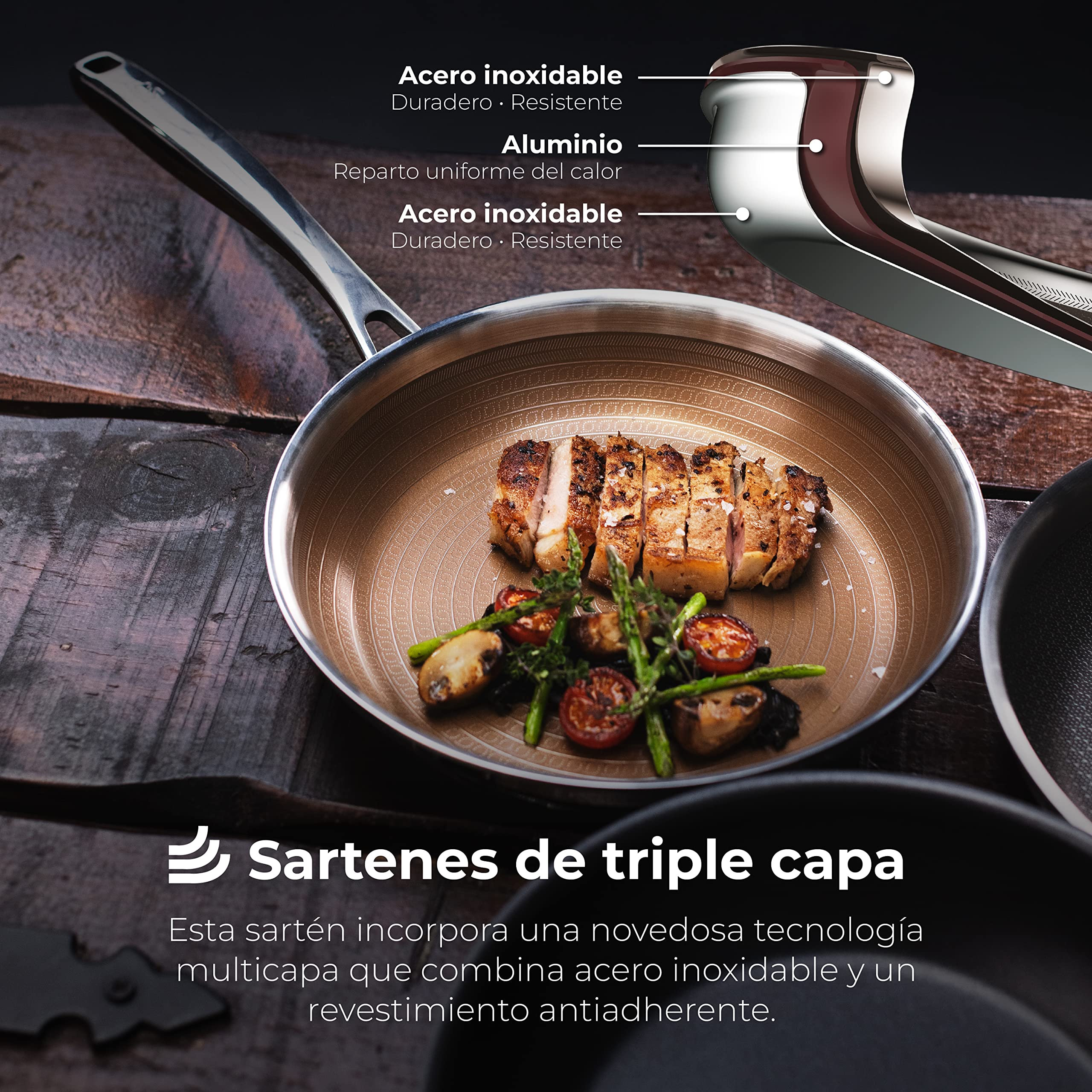 Consigue una calidad profesional en tu menaje de cocina con la sarten antiadherente de la colección Hi-tech 3 de Masterpro . Esta sartén esta fabricada en acero inoxidable 18/10 con un núcleo de aluminio Compatibile con piani cottura a induzione, a gas, alogeni, in vetroceramica ed elettrici. Calore uniforme e peso ridotto: la struttura del pavimento in combinazione con lo strato di alluminio consente una distribuzione uniforme del calore. TECNOLOGIA TRE STRATTI: la nostra padella è composta da un fondo in acciaio inox, un materiale molto resistente, un altro strato di alluminio che distribuisce il calore e infine è rivestita con un motivo a nido d'ape antiaderente. Adatta a tutti i tipi di fornelli: con la nostra padella potrete dare libero sfogo alla vostra creatività culinaria e preparare tutti i tipi di ricette a livello professionale. Set Padelle MasterPRO BERGNER Hi-Tech 3 | Padella Antiaderente Da 20 Cm | Acciaio Inossidabile Con Texture A Nido D'ape | Rivestimento A 3 Strati | Utensili Da Cucina | Adatto A Tutti I Tri Laminato Giro Gold3 Il manico in acciaio inox è ergonomico e si adatta bene alla mano.
