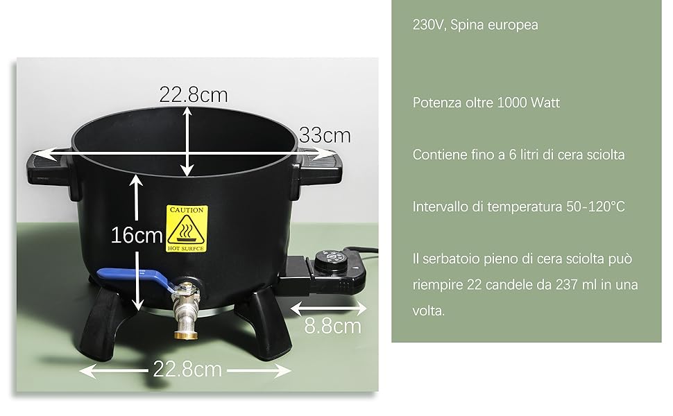 Vaso Per Melter Per La Creazione Di Candele, Grande Vaso Elettrico Per La Cera Per Candele Produci oltre 35 candele (120 ml/barattolo) in una sola fusione! Le migliori offerte per Melter per La Creazione Di Candele , Grande Vaso per Sciogliere La Cera Da 6 L, C sono su Confronta prezzi e caratteristiche di prodotti nuovi e usati Molti articoli con consegna gratis Il nostro fonditore per cera da 4,3 litri consente di risparmiare il 50% di tempo rispetto ai piccoli vasi, perfetto per piccole imprese e artigiani che apprezzano la produttività. Inizia la tua candela con fiducia! Include un vaso da 1,2 l per disegni dettagliati + supporto esperto 24/7. Sostituiremo QUALSIASI difetto, senza fare domande. Dagli hobbisti agli imprenditori: crea sempre candele uniformi e di qualità professionale. Con un intervallo di controllo della temperatura da 0 a 200 °C, maggiore è la temperatura più veloce è la fusione.