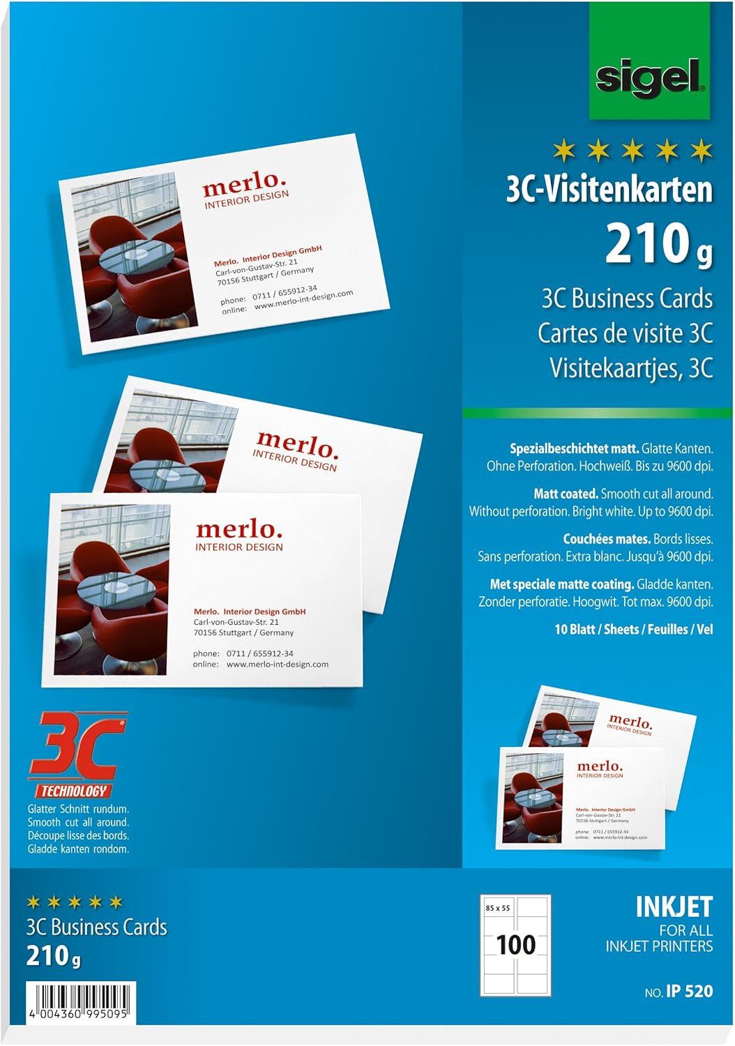 La nostra offerta: software e downloads gratuiti Inizia subito a personalizzare i tuoi biglietti da visita con una delle seguenti soluzioni proposte da SIGEL : Templates per MS Word e software Business Cards in Two Minutes scaricabili gratuitamente dal sito web di SIGEL. Grammatura: 250 g, certificato FSC, Conf; da: 40 fogli = 400 pz Cartoncini Bianchi A4 SIGEL DP830 Biglietti Da Visita, Microperforati, Bianco, 85x55 Mm (A4), 185 G, 150 Pz.=15 Fg Biglietti Da Visita Personalizzati Biglietti da visita con angoli arrotondati, per creazioni personalizzate al PC e stampante. Taglio netto tutt'intorno senza perforazione Cut: taglio netto tutt'intorno. Per ulteriori requisiti più ricercati, raccomandiamo l'acquisto del programma Business Card Software, cod. art. Formato stampa: A4 (210x297 mm); formato singolo: 85 x 55 mm Responsabilità ambientale Per amore dell'ambiente: carta sbiancata senza cloro, proveniente da foreste a gestione sostenibile. La prima impressione è quella che conta: I biglietti da visita di alta qualità restano un segno di professionalità I biglietti idonei alla stampa su due lati possono servire anche da vouchers, carta d'identità, ecc Clean Cut Cards: tecnologia 3C Clean: senza perforazione. Biglietti da visita nella tecnologia 3C I biglietti da visita SIGEL nella tecnologia 3C soddisfano i standard di qualità: taglio netto tutt'intorno, senza perforazione e robusto cartoncino di alta qualità. Ottima qualità, grazie al robusto cartoncino di alto livello. Microperforazione La microperforazione ultra fine assicura la facile separazione dal retrofoglio e angoli precisi, quasi come fossero tagliati.