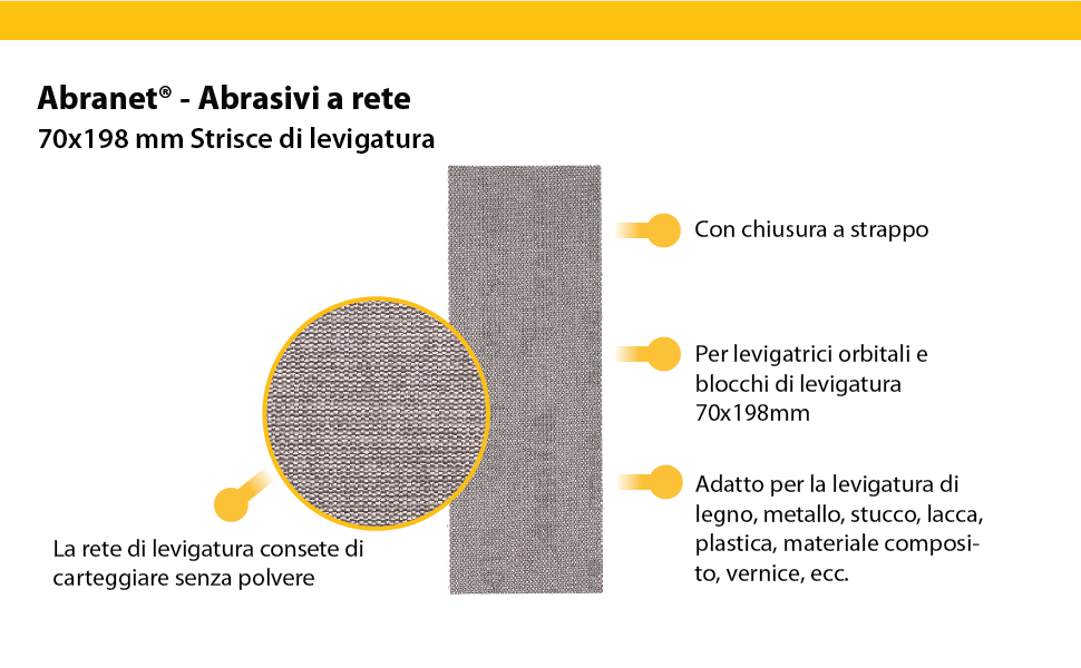 Rete Abrasiva Per Cartongesso Carta Vetrata Per Muro Mirka Abranet - Strisce Abrasive A Rete, 70 Mm X 198 Mm, Confezione Da 5 Di Ogni Grana 80, 120, 180, 240, 320, 400/30 Pezzi/per Levigare Legno, Spatola, Vernice, Plastica Levigatrici Rotorbitali Stucco Legno Descrizione prodotto Strisce abrasive a rete,25 Strisce di Levigatura 70x198 mm Confezione Grana 80, 120, 180, 240, 400 per Levigare Senza Polvere Legno, Stucco, Vernice, Plastica Specifiche: Dimensioni: 70*198 mm. Abranet è un abrasivo eccezionale con proprietà uniche. Con la sua innovativa costruzione a rete , ha rivoluzionato il mercato della levigatura senza polvere. Gli utilizzatori di Abranet sono convinti delle sue prestazioni e non tornerebbero a un abrasivo La confezione include: 25 pezzi griglia di levigatura professionale con grana 80/120/180/240/400 ALTA QUALITÀ: realizzato in fibra di vetro ad alta resistenza e rivestito con ossido di alluminio abrasivo per gravità o impianto di sabbia elettrostatica. Robusto e antistatico, ideale per levigatura e lucidatura. Levigatura senza problemi: in combinazione con una levigatrice orbitale e aspirazione, la polvere risultante può essere aspirata direttamente attraverso la struttura a rete, riducendo la polvere abrasiva. CONFEZIONE PERFETTA: offriamo 25 pezzi di nastri abrasivi grana 80/120/180/240/400 in diverse grane per soddisfare le vostre esigenze per tutti gli scenari di levigatura, questa è la scelta ideale, dimensioni: 70 x 198 mm.