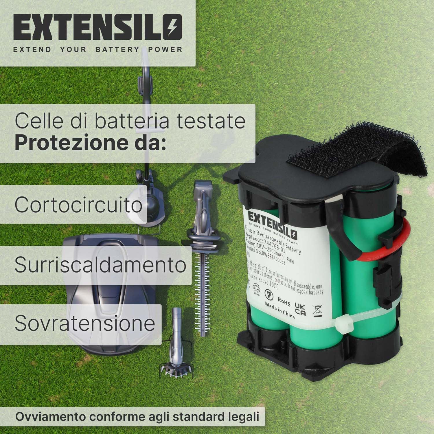 EN STOCK : EXTENSILO 2x Batteries compatible avec McCulloch ROB R1000 2017, ROB R1000 2019, ROB R1000 2018 , ROB R600 2017 tondeuse 3000mAh, 18V, Li-ion, 180876438-20 pas cher. Livraison rapide partout en France Conforme alle norme di legge | Protezione da cortocircuito, surriscaldamento e sovratensione ): 7,1 x 6,7 x 5,5 cmCOMPATIBILE CON: - McCulloch ROB R1000 2019 - McCulloch ROB R600 2017 - McCulloch ROB R600 2018Per garantire la compatibilità, verificare se la batteria ricaricabile attualmente in uso è presente nell'elenco. - Batteria ricaricabile di ricambio, compatibile e di alta qualità, ad alta capacità, per dispositivo da giardinaggio (Può trovare tutti i modelli corrispondenti qui di seguito) - La batteria può essere caricata con il Suo caricabatterie standard o con uno compatibile - Le nostre batterie ricaricabili soddisfano tutti i requisiti rilevanti per la sicurezza operativaCONTENUTO DELLA SPEDIZIONE: - 1x batteria ricaricabileSPECIFICHE TECNICHE: - Tecnologia: Li-Ion - senza effetto memoria - Capacità: 3000 mAh - Tensione: 18 V - Energia: 54 Wh - Numero di celle: 5 - Peso: 267 g - Dimensioni (Lung. x Larg. x Alt. Batteria ricaricabile per robot tagliaerba | Ogni cella della batteria è testata ᐅ MobiloTec Akku Kompatibel Mit McCulloch ROB R600 2017 Akku Akku 1500 Mah 1 St S0w4d0q1 Le nostre batterie di ricambio sono progettate per prestazioni straordinarie e una massima durata.