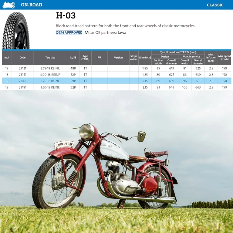 Find the best deal on 3.25-18 H03 Classic Reinf Mitas Highway Tyres at GEO Tyres. For the rider looking to ride on both city streets and easy dirt roads in all weather conditions*, the Mitas 3.25-18 H03 is an exceptional choice Mitas H03 3.25-18 59P TT • • Prezzo Il marchio Europeo Mitas produce pneumatici di alta qualità ed affidabilità da oltre più di 80 anni.