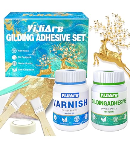 Resistente ai Graffi e Facile da Usare: L'adesivo per foglia oro offre un’eccellente adesione, impedendo che i design in foglia oro si danneggino facilmente. Che si tratti di superfici lisce, legno, vetro, ceramica, carta o metallo, questo kit trasforma oggetti quotidiani in vere opere d'arte, aggiungendo un tocco di eleganza e lusso a qualsiasi progetto. Colla Vinavil Foglia Gold, 120 Ml Di Colla Per Foglia Oro A Base D'acqua E Fogli Colorati In combinazione con la vernice a base d’acqua, garantisce una finitura durevole e resistente all’usura e all’ossidazione nel tempo. Ti risponderemo entro 24 ore con una soluzione professionale. Sicuro e Atossico: Utilizziamo una formula esclusiva progettata specificamente per l’applicazione di foglia metallica, con un adesivo a base d’acqua inodore, pulito e atossico, ideale per progetti da interni. Servizio Post-Vendita: Per qualsiasi domanda o problema relativo al set per doratura con foglia oro, contatta il venditore tramite Amazon. Kit Completo di Adesivo per Doratura: Il set di adesivo per foglia oro YiJiAre include tutti gli accessori necessari: 120 ml di adesivo per foglia oro, 120 ml di vernice, 100 fogli di foglia oro, 2 pennelli, 2 paia di guanti, 1 pinzetta, 1 piccolo spruzzatore e 1 rotolo di nastro adesivo per mascheratura.