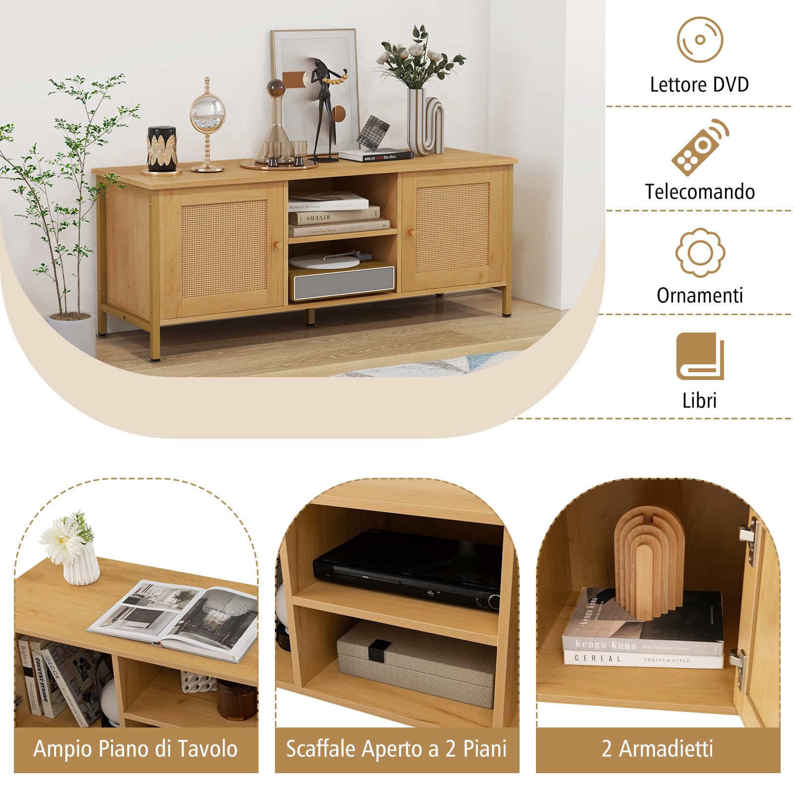 I 3 fori per la gestione dei cavi sul retro mantengono la zona circostante pulita ed ordinata. Oltre ad essere un mobiletto per la TV, può essere un'aggiunta elegante e funzionale in qualsiasi spazio. Cosa Rende i Nostri Prodotti Diversi: Piano di appoggio spazioso per TV fino a 65 Soluzioni di stoccaggio efficienti e ben organizzate Stabilità eccezionale grazie alle 5 gambe metalliche Dettagli user-friendly per una maggiore praticità d'uso Design versatile adatto a diversi ambienti domestici Piedini antiscivolo per una maggiore sicurezza e stabilità Cerniere ammortizzate per una chiusura sicura delle porte Informazioni Dettagliate sul Prodotto: Colore: Naturale + Grigio Materiale: Legno Ingegnerizzato, Metallo Dimensioni del Prodotto: 152 x 40 x 40 cm (L x P x A) Dimensioni della Piccola Mensola Aperta: 36 x 38 x 12,5 cm (L x P x A) Dimensioni Interne dell'Armadio: 36 x 38 x 27 cm (L x P x A) Altezza dei Piedini: 10,5 cm Capacità di Carico Totale: 165 kg Peso Netto: 24,5 kg Contenuto della confezione: 1 x Mobile TV Soggiorno 1 x Manuale di Istruzioni Avviso di sicurezza Attenzione: leggere attentamente le istruzioni di montaggio e seguire le istruzioni di sicurezza per garantire un montaggio e un utilizzo sicuri del televisore. KOMFOTTEU Mobile TV Soggiorno in Legno, Mobile Porta TV Liberamente Combinabile, per TV fino a 65, Mobiletto TV Multifunzione con 6 Vani Aperti, 134 x 30 x 43 cm, Nero (QE09327FQDE PIANO DI APPOGGIO SPAZIOSO: Goditi un ampio piano di appoggio adatto per TV fino a 65. Con 2 armadietti laterali, 1 grande scomparto e 2 ripiani aperti, le soluzioni di stoccaggio efficienti mantengono libri, telecomandi e altri oggetti ben organizzati. Mobiletto Tv Moderno Mobile Tv Soggiorno COSTWAY Mobile Porta TV Combinabile Con Ripiani Mobile Porta Tv Da Interno DESIGN VERSATILE PER OGNI AMBIENTE: Questo mobile sotto tv multifunzionale si adatta a diversi ambienti come il soggiorno, l'ingresso o lo studio grazie al suo design elegante. Questo mobile TV moderno permette di avere uno spazio sufficiente per una visione confortevole e un'organizzazione ottimale degli accessori e dei dispositivi collegati. Evitare di lasciare il mobile incustodito, soprattutto se ci sono bambini. STABILITÀ ECCELLENTE: Grazie alle 5 gambe metalliche e ai piedini antiscivolo, il mobile per TV offre una stabilità eccezionale. SOLUZIONI DI STOCCAGGIO EFFICIENTI: Con 2 armadietti laterali, 1 grande scomparto e 2 ripiani aperti, il mobile per televisori offre soluzioni di stoccaggio organizzate per libri, telecomandi e molto altro.