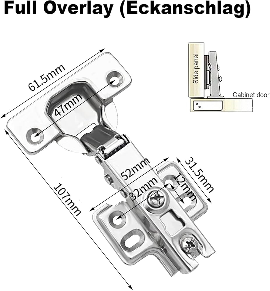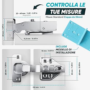 Rimovibile Basta premere l'estremità posteriore per rimuovere insieme la cerniera e la porta. [MATERIALE IN ACCIAIO INOSSIDABILE]: la cerniera è realizzata in acciaio inossidabile di alta qualità, con elevata tenacità, elevata durezza, antiruggine, lavorazione pregiata, qualità garantita e può resistere a ripetuti test di apertura e chiusura della porta dell'armadio Braccio di appoggio ispessito 10 piastre in acciaio ispessite per una resistenza stabile del braccio, durevoli e non facili da rompere. Compra 10 pezzi Cerniera per Mobili 110 Grado Battuta Esterna Cerniera Ante di Armadio Soft Close Cerniera Ammortizzata con Ammortizzatore Idraulico Cerniera Mobile Cucina a prezzi vantaggiosi su . Spedizione Gratuita disponibile per membri Prime su oltre un milione di prodotti Design della tazza della cerniera Aumentare la superficie portante dell'anta dell'armadio per fissarla saldamente. Removable Type Fisso Per rimuoverlo è necessario svitare tutte le viti. Pistoni Per Ante Cucina 10Pcs Cerniera Per Mobili,cerniere Del Gabinetto, Freddo Rotolamento Cerniera Con Viti, Piena Sovrapposizione Muto Cucina Unità Cerniere Per Bagno Camera Da Letto Sala Da Pranzo Cerniera Per Ante Cucina [CHIUSURA SILENZIOSA]: con la tecnologia Soft-Close per garantire una chiusura morbida e senza rumore, non solo proteggono le dita, ma prolungano anche la vita dei mobili e degli armadi Braccio a molla La struttura della molla è ispessita e non si rompe facilmente dopo ripetute espansioni e contrazioni. Pulsante di rilascio Premere l'interruttore all'estremità della cerniera per rimuovere l'anta dell'armadio, risparmiando tempo e fatica [DIMENSIONE CERNIERA]: Con un diametro del foro di 35 mm (alloggiamento cerniera), una profondità di 11,5 mm e un angolo di apertura di 110° Adatto per spessori porta: 12-18 mm, spaziatura fori inferiori: 32 mm e 12 mm Rivetti ispessiti Può essere aperto e chiuso più volte senza cadere ed è durevole.