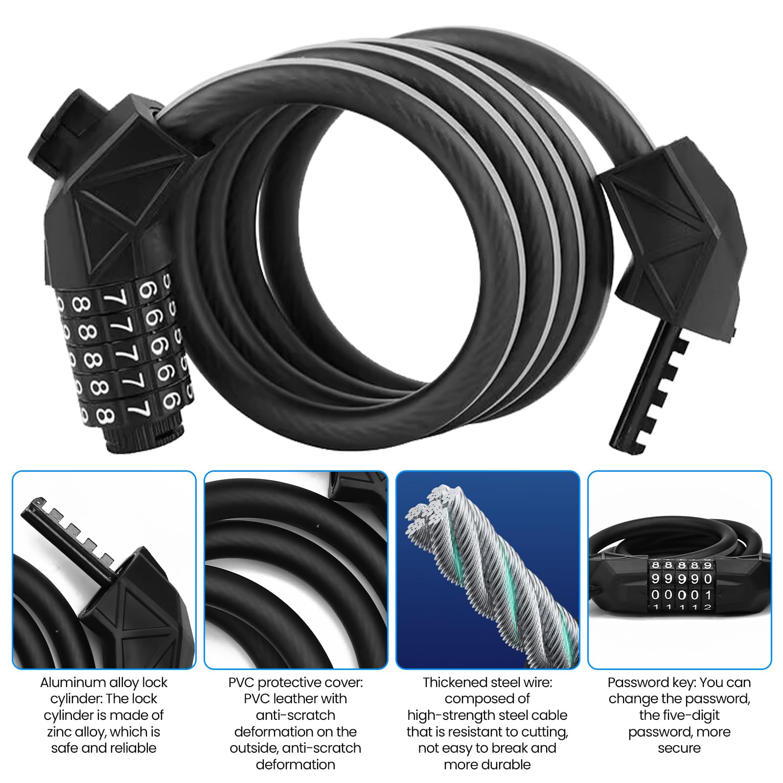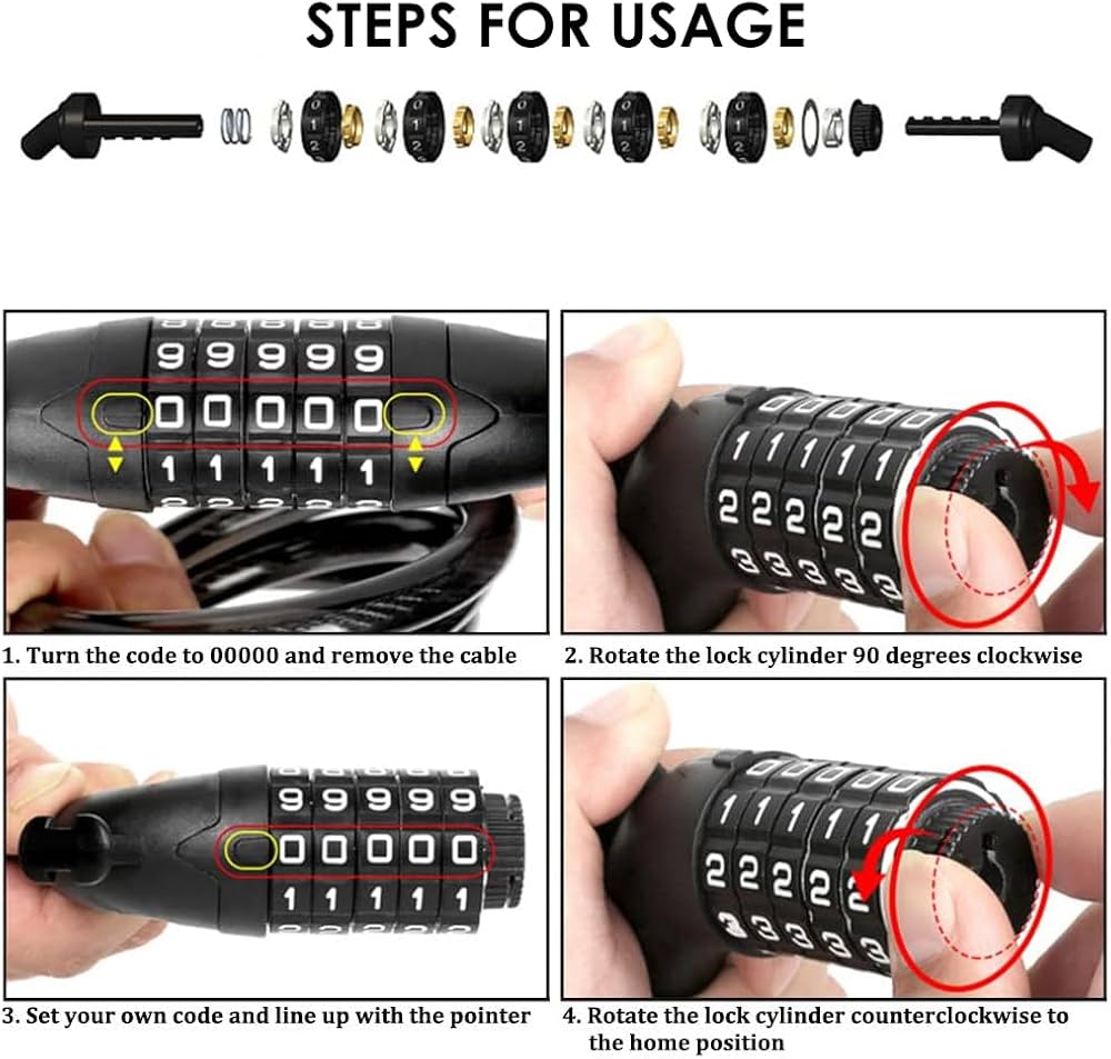 Consultare le istruzioni allegate. PERFORMANCE DELLA CHIAVE: La serratura a chiave di chiusura è fatta di un nucleo interno spesso con una struttura della testa della serratura in lega di alluminio, fornendoti una protezione più sicura e un migliore effetto antifurto. Lucchetto per bicicletta resistente ad alta sicurezza: seghetti, tronchesi e ruggine. Il lucchetto bici viene fornito con un supporto per bicicletta (diametro 2,6 cm). Il materiale principale del lucchetto per bicicletta è stato migliorato per essere più resistente. MATERIALE DEL CAVO D'ACCIAIO La serratura della bicicletta è fatta di materiale leggero del cavo d'acciaio di 12mm di spessore, ad alta resistenza, forte e durevole ma leggero, può sopportare una forte pressione senza deformazione, la superficie è protetta da un rivestimento in gomma trasparente con un buon agente antiruggine, può sopportare una forza di trazione di 2.4kN e una forza di taglio di 7kN.NOTE D'UTILIZZO 1. Quando si imposta la password, assicurarsi di ruotare la manopola RESET incorporata di 90°. 2. Assicurarsi che i numeri siano in corretta posizione quando si inserisce la combinazione, quando si apre e quando si chiude il lucchetto. È meglio fare una foto della password appena impostata. - Il lucchetto è arrivato con difetti visibili. Il lucchetto per bici include istruzioni dettagliate per il reset. Dopo aver impostato una nuova password, la password originale “00000” non è valida più, quindi assicurati di ricordare la password personale che hai reimpostato, altrimenti non puoi aprire il lucchetto della password. Per mantenere il prodotto funzionante nel tempo, non bloccarlo o sbloccarlo con la forza. 3. Dopo aver impostato una nuova password, la password originale “00000” non è valida più, quindi assicurati di ricordare la password personale che hai reimpostato, altrimenti non puoi aprire il lucchetto della password. Il lucchetto per bicicletta è realizzato con un cavo d'acciaio intrecciato di 1,2 cm di spessore. Caratteristiche: 5 cifre lucchetto a combinazione bicicletta . 6 ft di lunghezza del cavo . Combinazione biciclette combo in acciaio cavo del lucchetto Se hai incontrato questi casi inseguiti, ci contatta subito per avere una sostituzione: Antifurto Moto Monopattino Elettrico Lucchetto Per Bicicletta, Serratura A U Con Cavo Flessibile In Acciaio Da 1, 2 , 2 Pattini, Supporto, 2 In 1, Ad Alta Sicurezza Per Mountain Bike Su Strada Bici Elettrica Lucchetto Combinazione Lucchetto Bici intelligente e ripristinabile a 5 cifre - La combinazione impostata in fabbrica è 00000. Questo lucchetto bici può essere facilmente modificato con la combinazione desiderata. Lucchetto bici con staffa, facile da installare e da trasportare. Descrizione prodotto Lucchetto Bici 1800MM di Lunghezza Il lucchetto può essere lungo fino a 1800MM Ideale per biciclette e molti altri oggetti che si desidera bloccare.