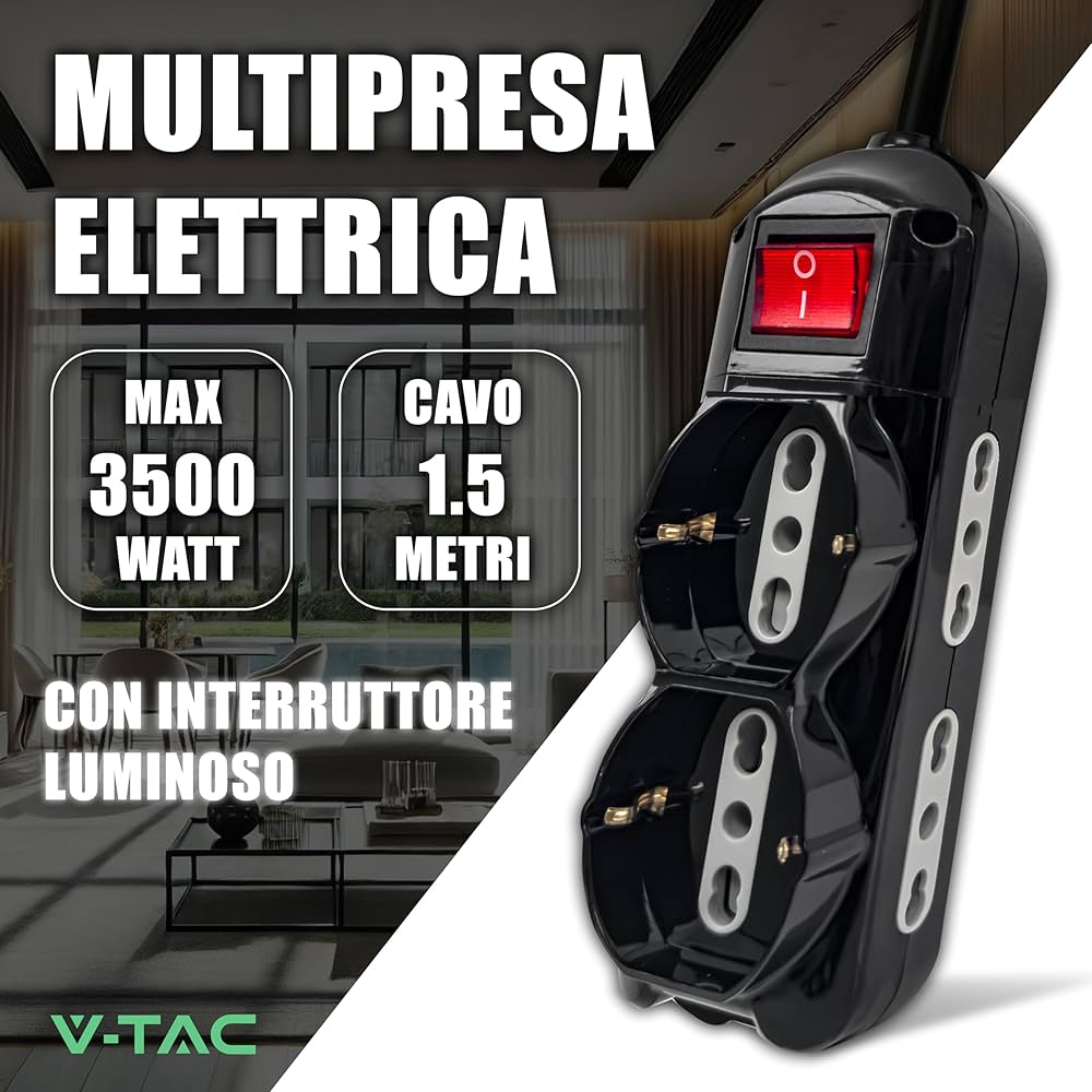 IN STOCK: V-TAC Ciabatta Multipresa Elettrica con Interruttore e Cavo da 1,5 Metri - 4 Prese 10/16A Bipasso 2P+T - Con Spina 16A - Presa Elettrica per Casa, Ufficio, Negozio - Colore Bianco, 8740-A al miglior prezzo. Consegna rapida in tutta Italia APPLICAZIONI: Multipresa ideale per uso domestico, ufficio negozio, garage, azienda. Il suo design lo rende perfettamente adatto a qualsiasi ambiente. COLORE: Bianco. Ciabatte Elettriche V-TAC Multipresa Con Cavo 1,5mt 3 Prese 10/16A 2P+T Bipasso Con Prolunga Elettrica DETTAGLI: Il cavo di alimentazione è altamente isolante e resistente in PVC all’esterno e migliora la resistenza e la durata nel tempo. MULTIPRESA V-TAC: Ciabatta Multipresa 12 Posti 4 Polivalenti (Schuko 10/16A) 8 bivalenti 10/16A con Cavo da 1 ,5 Metri e Spina 16A.