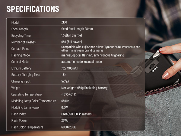 Riciclando in un rapido 2,8s, lo speedlight è ideale per la fotografia e la videografia versatili come elemento essenziale per i creatori di contenuti e gli influencer. 【Modalità Flash Manuale/S1/S2】 Il flash per fotocamera presenta le modalità M/Manual, S1, S2. La modalità Manual consente un'uscita flash precisa da 1/128 a 1/1, con la modalità slave ottica S1/S2 (disponibile solo in modalità Manual) per l'attivazione wireless. NEEWER Z160 SE Camera Flash, Speedlite 20Ws GN15 6000±200K, Modalità S1/S2 Potenza Manuale 1/1-1/128 Batteria 3,7V/1200mAh 650 Flash Piena Potenza, Compatibile con Canon Nikon Sony Fuji Olympus Camera La sua temperatura colore di 6000±200K assicura una resa cromatica accurata, mentre la lunghezza focale fissa di 35mm si adatta a vari stili fotografici. 【Compatto ma Potente】 Il flash compatto fornisce un'uscita da 20W con un numero guida di GN15 a ISO 100, offrendo un'illuminazione morbida e naturale con il diffusore incluso. Con protezioni di sicurezza integrate contro sovraccarico, sovrascarica, sovracorrente e cortocircuiti, questa luce flash per fotografia in studio garantisce un utilizzo affidabile per ogni foto La modalità S1 si sincronizza con il primo flash della luce principale per le impostazioni manuali, mentre S2 sopprime i pre-flash e si sincronizza con il secondo flash per gli ambienti TTL, consentendo un'attivazione senza interruzioni 1 Parametri 2 Diffusore Con il suo esclusivo quadrante rotante e l'elegante schermo di visualizzazione, il camera flash aggiunge un tocco di eleganza alla tua attrezzatura fotografica. 【Mini Flash per Fotocamera Elegante】 Ecco il nostro mini flash, un mix perfetto di fascino vintage e funzionalità moderna. Flash Camera NEEWER Z160 SE Camera Flash, 20Ws GN15 6000±200K Speedlight, Manual 1/1 Flash Nikon
