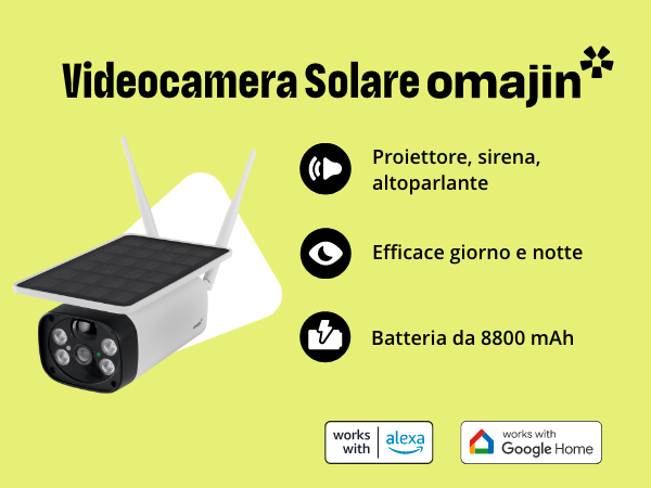 1 Caratteristiche 1 2 Caratteristiche 2 Ecco fatto, nel giro di pochissimo i battiti tornano regolari: la tua casa è al sicuro. Monitoraggio accurato 24 ore su 24, 7 giorni su 7. ADDIO FALSI ALLARMI: REGALATI PIÙ SERENITÀ La videocamera rileva rumori e movimenti e distingue perfettamente gli esseri umani dagli animali (che non ce ne vogliano i gatti). La scheda microSD da 32 GB in dotazione consente di memorizzare localmente in totale sicurezza tutti i dati. Robusta e resistente all'acqua (grado IP55), sorveglierà i tuoi spazi esterni anche in caso di meteo avverso. Videocamera 1 - Meteo 0. VIDEO ARCHIVIATI IN EUROPA IN TOTALE SICUREZZA La sicurezza dei dati personali è la nostra priorità. La sicurezza dei tuoi dati è la nostra priorità! FACILE DA UTILIZZARE ED ECO-FRIENDLY: Monitora i tuoi spazi esterni giorno e notte grazie alla videocamera solare wireless. È inoltre possibile sottoscrivere un servizio cloud opzionale all'interno dell'app. Si alimenta in totale autonomia grazie a un pannello solare che ti farà consumare meno energia. Tu soltanto potrai accedere da qualsiasi luogo e in qualunque momento ai tuoi video protetti, parola d'onore! I video sono protetti e accessibili esclusivamente da te, ovunque tu sia e in qualsiasi momento. MASSIMA EFFICACIA 7 GIORNI SU 7, ANCHE DI NOTTE: Grazie alla visione notturna HD 1080P, la videocamera vede tutto anche di notte. Scopri le migliori offerte per Netatmo OMAJIN by, 2 x Telecamera Esterno con Pannello Solare, Wi-Fi, Visione Notturna HD, Sirena da 105 dB, Rilevamento Persone/Movimenti/Suoni, 2 Vie Audio, IP55, WIFI 2.4, OBU-2OSC - - Offerte e Coupon: #BESLY Grazie all'app omajin, controlla e gestisci in tutta semplicità tutti i tuoi elettrodomestici da un'unica app. Il proiettore della videocamera, la sirena da 105 dB e l'altoparlanete mettono in fuga i malintenzionati senza neanche bisogno che tu apra la porta. Telecamera Wi-fi Esterno OMAJIN BY NETATMO - Telecamera Wi-fi Da Esterno Senza Fili A Batteria Videocamera Sorveglianza Esterno Ottimo per l'ambiente e per le tue tasche. 64 Gb, USB-C, 4 batterie 18650 agli ioni di litio, WIFI 2,4 GHz Un ecosistema smart pensato per ottimizzare e facilitare l'utilizzo dei prodotti anche a distanza. Hai ricevuto una notifica? Controlla sullo smartphone che a casa è tutto in ordine.