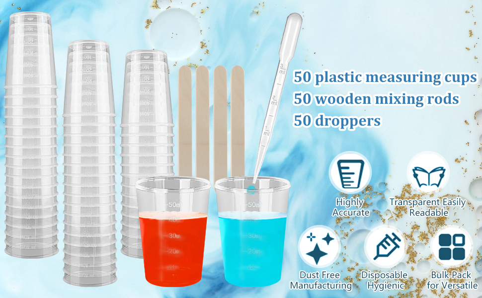 NLONLL Set Misurini In Plastica 50ml Bicchiere Graduato Plastica 50 Pezzi Tazze Di Miscelazione Trasparente Misurino Con 50 Bastoncini Legno Per Miscelare Vernice Resina Epossidica Cucina