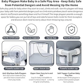 Sicurezza prima di tutto con materiali durevoli: realizzato pensando alla stabilità, il nostro grande box per bambini è dotato di tubi in acciaio ispessito che resistono alla deformazione. Box pieghevole con la cerniera posizionata all'esterno (Nota: nessuna imbottitura nella parte inferiore, è necessario acquistare un tappetino da gioco per abbinare la recinzione per un maggiore comfort) Recinti In Plastica Per Neonato YIFOV E Bambini, Sicurezza Da Giardino Con Schiuma Anticollisione E Rete Traspirante, Centro Attività Per Bambini Al Coperto, Tra Cui Box Per Neonati 1 tappetino in cotone extra large 1 custodia per recinzione. Realizzato in tessuto Oxford 150D resistente agli strappi e una copertura interna in cotone, oltre a una protezione angolare imbottita, questo box protegge il bambino da tutte le angolazioni con 4 connettori a ventosa in TPR (assicurarsi che i connettori siano puliti per un'adesione ottimale) Goditi la tranquillità mentre il tuo bambino fiorisce! Box per neonati e bambini: il nostro spazioso box misura 200 x 180 cm. Libertà per i genitori: crea un'area giochi sicura per bambini, consentendo al bambino di esplorare liberamente tenendolo lontano dai pericoli. Con i nostri bambini box puoi fare multitasking, guardare il tuo bambino giocare mentre lavori, fai le faccende domestiche o semplicemente prenditi un momento per te stesso. Contenuto della confezione: Dotato di 60 palline oceaniche 1 cestino a rete. 4 passanti per manico. Dotato di 4 anelli pull-up e 60 palline oceaniche colorate, oltre a un comodo cestino, questo box da gioco per bambini promuove il gioco interattivo e lo sviluppo delle abilità, rendendo il gioco sicuro e divertente! Le ventose antiscivolo inferiori aumentano l'area delle ventose e migliorano la forza di aspirazione, in modo che la recinzione del bambino non sia facile da ribaltare e spostare. Protezione multipla. Maggiore potenza di aspirazione.