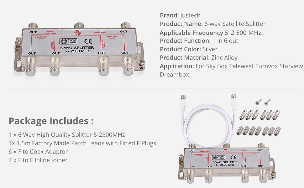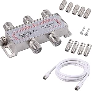 Compra Justech 6 Way TV CATV Broadband Splitter 5-2500MHz / 6 Vie Cavo Splitter F-Connettore Adattatore / 6 Vie Splitter Satellitare/Ripartitore F a Due vie per Cavo Antenna TV SAT, HDTV, Full HD. SPEDIZIONE GRATUITA su ordini idonei Compatibile con i Cavi Coassiali RG59 e RG6. 【Pronto per l'Uso】Il Prodotto Viene Fornito con un Cavo RG6 Placcato in Oro di Alta Qualità, Insieme a 6 Adattatori F-to-Coax Placcati in oro e 7 Connessioni F-to-F in Linea Placcate in Oro, Pronti per l'Uso e per Ridurre le Perdite Inutili. Ogni Splitter Ha Un'Impressionante Gamma di Frequenza di 2,5 GHz (5-2500 MHz). 【Utilizzo Versatile】Questo Splitter Coassiale Digitale è Versatile e Compatibile con HDTV, TV Satellitare, Modem Internet ad Alta Velocità, TV Via Cavo, Antenne Amplificate e Altri Dispositivi Coassiali. 【Connessioni Placcate d'Oro】Forniscono la Migliore Connettività e Resistenza alla Corrosione e Offrono Prestazioni e Versatilità Senza Pari. Decoder Satellitare Neoteck 2 Way TV / CATV Broadband Splitter 2500MHz Coax Cable Splitter Bi-Directional With F To Coax Adaptor F F Inline Joiner I328268695 Amplificatore Antenna Tv I Nostri Splitter Garantiscono Una Trasmissione di Potenza Bilanciata su Tutte le Porte.