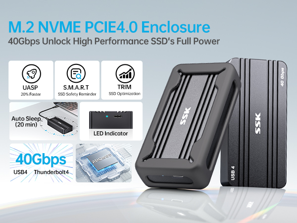【Installazione Semplice】Basta aprire la custodia dell'SSD con il cacciavite incluso, inserire l'SSD senza sforzo e l'SSD esterno è pronto. Per la compatibilità multipiattaforma tra Windows e macOS, consigliamo di formattare l'unità come exFAT Nota: la nuova unità potrebbe non essere rilevata inizialmente e necessitare di formattazione prima dell'uso. 【40Gbps USB4】SSK NVME USB 4.0 SSD Enclosure velocità massima 40 Gbps, trasferimenti dati rapidissimi fino a 3800 MB/s. 【Per SSD NVME】L'enclosure M. SSK 40Gbps M.2 NVMe SSD Enclosure, USB4 NVMe Caddy USB C for Thunderbolt 3/4, M2 External Enclosure Supports 2280/2260/2242/2230 SSD NVME Case Adapter M-Key with LED Indicator Aluminum 2 con il nostro alloggiamento NVMe. 【Archiviazione Esterna】Trasforma facilmente il tuo SSD NVMe in un SSD esterno portatile con il nostro box SSD NVMe. Compatto ma robusto, misura 4,1*1,9*0,8 pollici e pesa solo 168 g 【Potenza Nella Sicurezza Dati】Il nostro box m.2 supporta S.M.A.R. Nota: solo per SSD NVMe, non supporta SATA e altri SSD non NVMe Goditi il trasferimento dati senza interruzioni mentre sei in movimento, completato da un indicatore LED per il monitoraggio istantaneo dell'attività dell'unità. Ssd Esterno ORICO 40GBPS USB4 M.2 NVMe SSD Enclosure With Cooling Fan M2 NVMe Case Ugreen 40Gbps T, monitora lo stato di salute della guida in modo proattivo. 【Compatibile con USB-C】 Custodia da NVMe a USB 4 compatibile con computer, laptop, smartphone e tablet. TRIM mantiene prestazioni costanti, prolungando la durata del tuo SSD