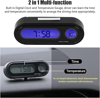 Sistema commutabile 12/24 ore Supporta la visualizzazione della temperatura interna. Facile da installare con nastro biadesivo Facile da installare con nastro biadesivo. Termometro orologio per auto Orologio digitale 2 in 1 e misuratore di temperatura con display LCD retroilluminato 12H24H – Ampia scelta di prodotti di alta qualità Alimentazione: batteria a bottone 2032. Nota: Considerare un margine di errore di 0-1 cm a causa della misurazione manuale. Prodotto di alta qualità. Orologio Con Termometro Digitale OROLOGIO TERMOMETRO TERMOMETRO Cruscotto Auto Digitale Portatile Con Orologio Per Auto Con retroilluminazione a LED La confezione include: 1 termometro digitale per auto Risoluzione display temperatura: 0,1 °C. Supporta la visualizzazione della temperatura interna Ampio display LCD che mostra chiaramente la data/temperatura Sistema commutabile 12/24 ore