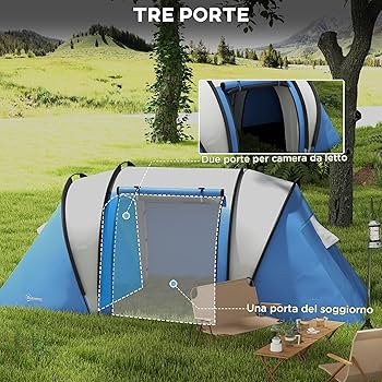 DIMENSIONI: Dimensioni complessive: 350L x 350P x 230Acm. MATERIALE SELEZIONATO: Il rivestimento è in tessuto di poliestere e Oxford con PU per la protezione dai raggi UV. Tenda Da Campeggio OUTSUNNY - 4-5 Posti Con 4 Porte A Cerniera, Zanzariera E Gancio, 350x350x230cm, Bianca E Blu Gazebo 3x3 Pieghevole Impermeabile AMPIO SPAZIO A DISPOSIZIONE: Questa tenda da campeggio può ospitare 4-5 persone. Il tessuto Oxford rimovibile sullo strato esterno offre privacy e ombra. NOTA: Sono richieste 2 persone per il montaggio Portare l''intera famiglia in campeggio non è mai stato così facile grazie a questa tenda da campeggio per 4-6 persone. Due diversi spazi ti danno privacy di notte e spazio per rilassarti durante il giorno Ideale per coppie in campeggio o escursioni in famiglia ZANZARIERE E TESSUTO OXFORD: 4 porte con apertura a cerniera e zanzariere mantengono l'interno ventilato e forniscono alla tenda un facile ingresso. Borsa per il trasporto, 12 picchetti e 4 corde incluse.