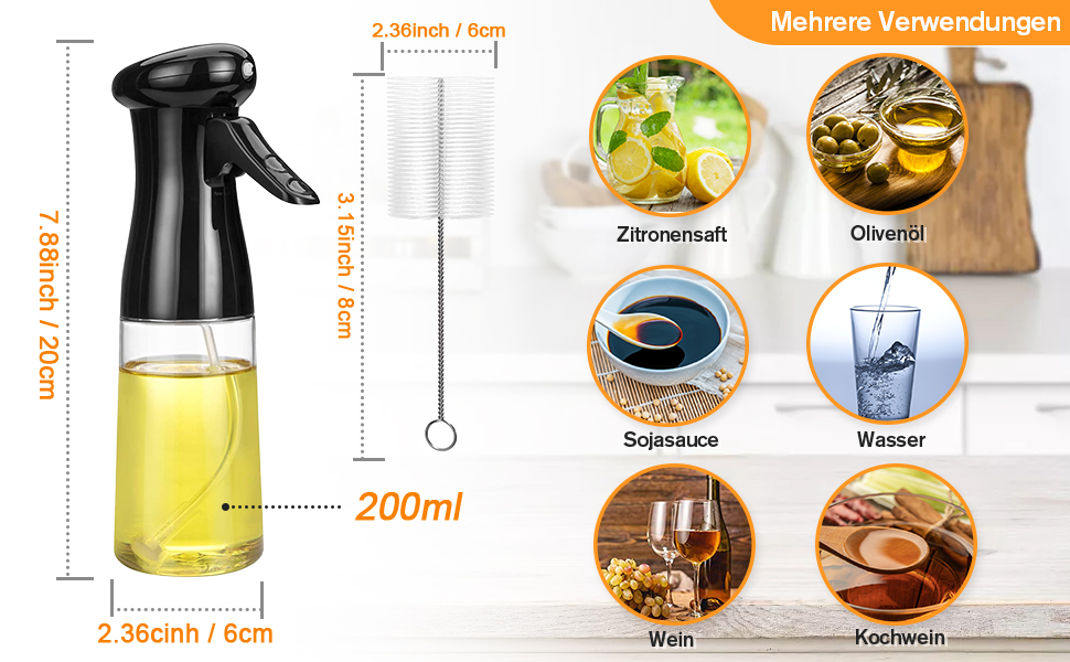 Il pennello in dotazione è molto utile per preparare i cibi e applicare le salse. Si può usare con fiducia. Materiale. 玻璃 ; Capacità. 240 Millilitri ; Numero di articoli. 1 ; Caratteristica speciale. Leggero ; Componenti inclusi. Spazzola per Olio in Silicone Spray Olio TEEZErshop Con Scala, Olio Spray Cucina Per Cucinare Nebulizzatore Olio Facile da Trasportare - Il design leggero e portatile ne consente l'utilizzo sia all'aperto che in cucina. Si può usare anche per innaffiare le piante in vaso. Design - Il design del nebulizzatore d'olio prevede una leggera nebbia fine, perfetta per una distribuzione uniforme in padella, nella friggitrice ad aria, nel forno, ecc. Spruzzatore d'olio Multiuso - Questo spruzzatore d'olio è adatto per olio d'oliva, olio di soia, olio di mais, ecc. Materiale Alimentare - Il flacone spray per olio è realizzato in vetro alimentare e PP, senza BPA e PET.