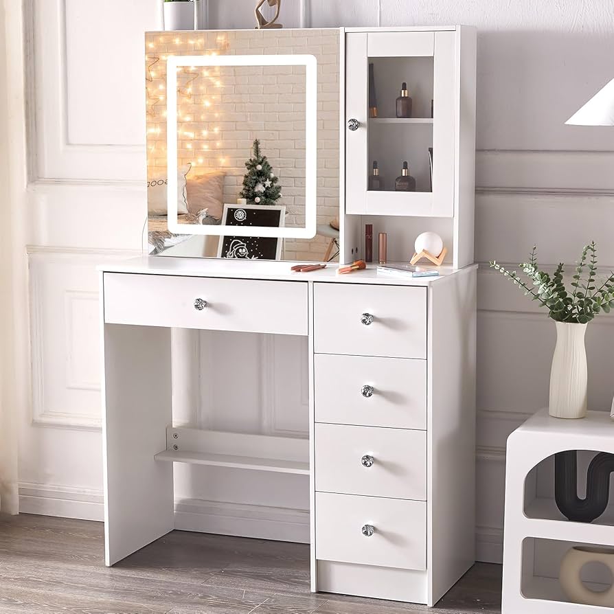Spazio portaoggetti. I 7 cassetti consentono di dividere lo spazio per conservare cosmetici, prodotti per la cura della pelle, gioielli, accessori, ecc 💯 【Montaggio Facile】Riceverai 1x tavolo da toeletta con specchio, 1x Sgabello, accessori di installazione, manuale di installazione. Ogni parte è etichettata. 🎀【Ampio Spazio di Archiviazione】Il tavolo da toeletta con specchio e sgabello combina perfettamente funzionalità e design estetico, dotato di 3 ampi cassetti, 6 ripiani aperti e 2 armadi per soddisfare le vostre diverse esigenze di spazio È non solo facile da pulire, ma anche semplice da mantenere 😘 Il tavolo da toeletta presenta un design elegante o classico che si adatta a diversi stili di arredamento interni, come il minimalismo moderno, il classicismo europeo o l'estetica retro, migliorando così la bellezza complessiva dello spazio Toeletta Da Trucco Organizer Trucchi Tavolo Da Trucco Moderno Con Specchio, Organizer Gioielli E Sgabello Tavolo Da Giardino Toilette Trucco ✅【Luminosità Regolabile】Il tavolo da toeletta con specchio dispone di 3 temperature di colore (fredda, naturale, calda) e luminosità regolabile, garantendo di poter sempre ottenere la luce perfetta per valorizzare la tua bellezza in ogni momento