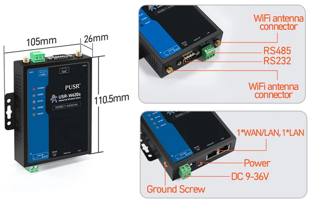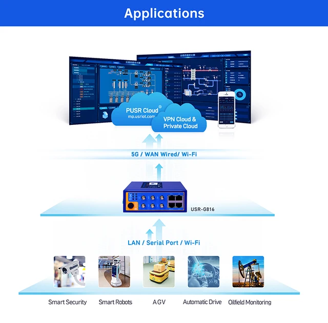 Industrial Grade Serial Server RS232/485 To WiFi and Ethernet, Modbus Gateway, MQTT Gateway, Metal Case. $29.99 - $33.99 Supporta la comunicazione dei dati Transparant MQTT/TCP/UDP/HTTP. Gateway Modbus: Conversazione del protocollo Modbus RTU/TCP, polling multi-host Modbus. Rs485 To Mqtt Gateway PUSR Global 5G Router Wireless Cellulare Industriale Dual SIM Card Slot RS232/485 Porta Ethernet Seriale Gigab USR-G816w-G PUSR USR-W610 Supporta la crittografia SSL/TLS in modalità di funzionamento client TCP, client HTTP e MQTT. Il prodotto integra 2.4G e 5.8G WiFi, con una velocità di trasmissione fino a 1267Mbps e integra anche 2* porte RJ45 (1WAN/LAN+1LAN) e 2 porte seriali (1 RS232+1 485), consentendo la trasmissione dei dati tra porte seriali, porte Ethernet e WiFi.