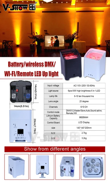 Perfetto per spettacoli di luci professionali o uso domestico. Molteplici opzioni di controllo: 6 modalità di controllo: DMX512 wireless a 2,4 GHz, modalità master/slave, programmi automatici, controllo audio, telecomando, controllo Wi-Fi e app (iOS/Android). Lights Out PUZILOZA 108 W Batteria LED Par Faro Ricaricabile RGBWA+UV Uplight Outdoor Con Telecomando/DMX Faretto A Batteria Il ricevitore wireless DMX512 integrato a 2,4 GHz consente la sincronizzazione di più luci senza fili. Ogni LED offre combinazioni di colori 6 in 1 (RGBWA+UV: rosso, verde, blu, bianco, ambra, viola) e una durata di 100.000 ore. Ideale per scenari di luce individuali e regolazioni dal vivo. 50 W Faro Par LED Batteria Uplight con telecomando, 6 in 1 RGBWA+UV DMX512 Luce da palco con 5500 mA Batteria incorporata ricaricabile per DJ discoteca party KTV matrimonio compleanno 24W Luce da Discoteca , 4 in 1 Luce da Palco LED RGB + COB DJ con Telec La batteria è pronta all'uso senza alimentazione elettrica – ideale per eventi mobili. Tecnologia LED di alta qualità: 6 potenti LED per faro con tolleranza di tensione del 600% per la massima affidabilità. Funzionamento intuitivo, impostazioni avanzate e selezione diretta dei colori – più semplice che con il telecomando.