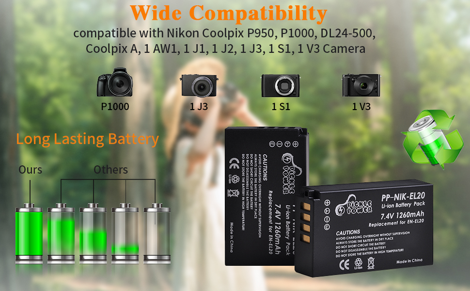 Display LED intelligente, stato di carica Dettagli della batteria: 7,4 V, 1260 mAh/9,32 Wh. Compatibilité parfaite : compatible avec les appareils photo numériques Nikon Coolpix P950, P1000, DL24-500, Coolpix A, 1 AW1, 1 J1, 1 J2, 1 J3, 1 S1, 1 V3 ; Chargeur LED à 2 canaux Nikon Coolpix Pickle Power EN-EL20 EN-EL20a Akku 2-Pack Und LED USB Ladegerät Für P1000, P950 Battery Charger La confezione include: servizio clienti 24 ore. Se avete qualsiasi domanda qui, non esitate a contattarci ordinando Le batterie EN-EL20 sono costituite da celle di batteria al litio di alta qualità senza effetto memoria, appositamente progettate per fotocamere digitali Nikon, rendendo la fotocamera più a lungo Contenuto della confezione: 2* batterie+1* caricatore+1* cavo di ricarica. Compatibile con: Nikon EN-EL20 Nikon Coolpix A, Nikon 1 AW1, 1 J1, 1 J2, 1 J3, 1 S1, 1 V3