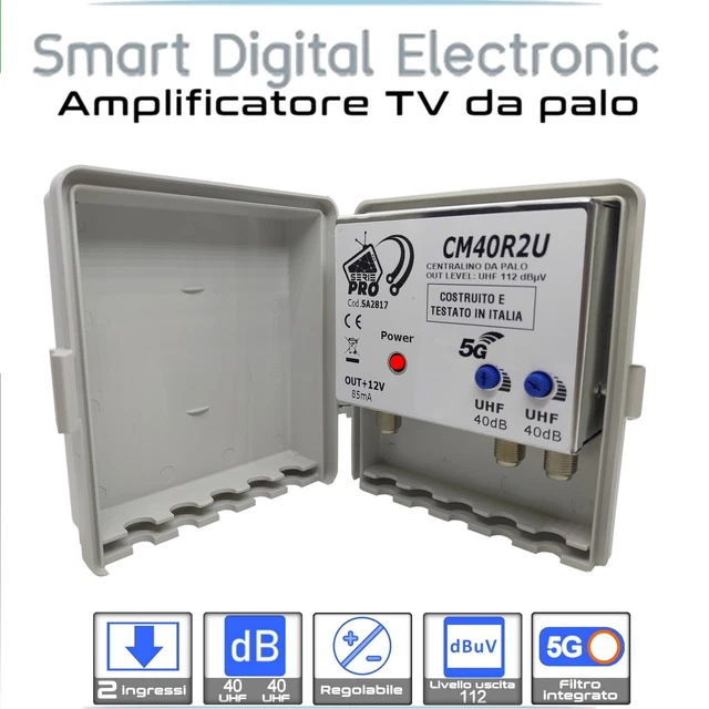 Amplificatore Tv 5g Interno AMPLIFICATORE ANTENNA TV Da Palo Con Filtro LTE/5G 23 DB 2 UHF+1 III 1 Amplificatore Antenna Tv Digitale Terrestre 50 Db AMPLIFICATORE TV: Potente amplificatore di segnale TV da palo con guadagno di 0 dB per una ricezione ottimale COMPATIBILITÀ: Adatto per segnali TV digitali terrestri, supporta tutti i canali DVB-T e DVB-T2 Gli amplificatori TV dispongono di filtro 5G integrato per permettere una corretta visione dei programmi trasmessi in DVB-T2 INSTALLAZIONE: Progettato per montaggio su palo esterno, resistente agli agenti atmosferici