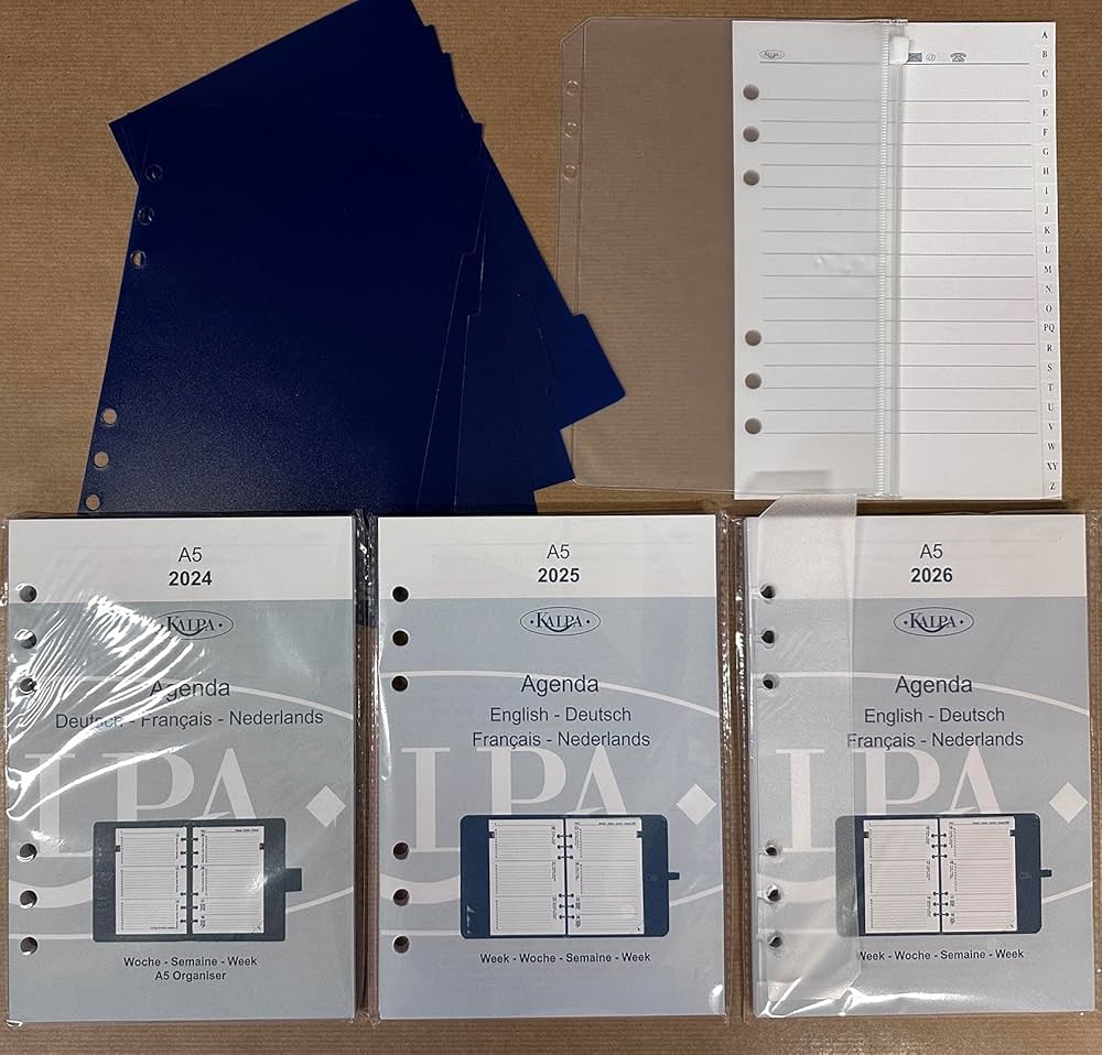 Agenda A5 Spezifikationen: Das Kalpa A5 Agenda Filler Paper für 2024 2025 2026 ist ein Muss für jeden, der eine umfassende und effiziente Möglichkeit sucht, seine täglichen Aufgaben, Termine und Zeitpläne zu organisieren. Tagebuch, organizer per agenda con 6 anelli, ricarica per fogli mobili, fogli mobili, per lista delle cose da fare, abitudini, filofax Die Agenda besteht aus 320 Blatt hochwertigem weißem Papier mit blauem Druck und bietet ein klares und leicht lesbares Layout. Format : format A5, 145 x 210 mm ; SPRACHEN : Die A5-Agenda-Papiere für 2024 und 2025 sind in Deutsch, Französisch und Niederländisch, die A5-Agenda-Papiere für 2026 in Deutsch, Französisch, Englisch und Niederländisch Zusätzlich zum Wochenlayout enthält dieses A5-Agenda-Filler-Papier einen Jahresplaner für die Jahre 2024, 2025, 2026 und 2027, so dass Sie problemlos für die Zukunft planen können. Das Kalpa A5 Agenda Filler Paper für 2024 2025 2026 ist ein Muss für jeden, der eine umfassende und effiziente Möglichkeit sucht, seine täglichen Aufgaben, Termine und Zeitpläne zu organisieren. Filofax A5 Refill 2025 A5 Nachfüllpapier Liniertes Papier 3 Stück, 6 Löcher Ringbucheinlagen 135 Blatt 270 Seiten Agenda Anelli A5 Ricaricabile SEITENLAYOUT: Sie können Ihre ganze Woche mit einem Blick auf eine Woche pro 2 Seiten Layout organizieren. Außerdem enthält er Notizblöcke für schnelle Notizen, To-Do-Listen und zum Notieren von Ideen. Jede Woche wird auf zwei Seiten dargestellt, wobei das praktische Zeitformat von 8:00 - 18:00 Uhr eine stundengenaue Planung der Tage ermöglicht. Mit seinem umfassenden Layout und benutzerfreundlichen Design ist das Kalpa A5 Agenda Filler Paper für 2024 2025 2026 das perfekte Werkzeug, um das ganze Jahr über organisiert und produktiv zu bleiben. Die Nachfüllungen für 2024 und 2025 sind in Deutsch, Französisch und Niederländisch, die Nachfüllungen für 2026 sind in Englisch, Niederländisch, Deutsch und Französisch.
