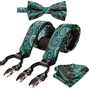 Unisex: design classico adatto per uomini e donne. Nessun sbiadimento e graffio: i denti interni in plastica proteggono i pantaloni da graffi da clip in metallo e scolorimento. Papillon Uomo Verde Set Bretelle E Papillon Giallo In Seta BRUCLE | Eleganza Luminosa Bretelle Da Uomo I prodotti dalla selezione dei materiali all'imballaggio sono stati rigorosamente esaminati per garantire che i prodotti non solo siano al passo con la tendenza, ma abbiano anche un'elevata durata. Il set di papillon e fazzoletto utilizza la migliore microfibra di seta jacquard a 1200 punti che è resistente, non si deforma e morbida. Dimensioni: 3,5 cm di larghezza e 120 cm di lunghezza. Originale set bretelle e papillon per uomo composto da bretelle strette per bottoni o clip in seta e papillon già annodato realizzato con la stessa seta , in una elegante fantasia macro paisley. Un set bretelle e papillon artigianale, interamente fatto a L'abbinamento con camicie e abiti può renderti più accattivante. La squisita cucitura ti rende perfetta. Confezionato in scatola regalo, perfetto anche come regalo.