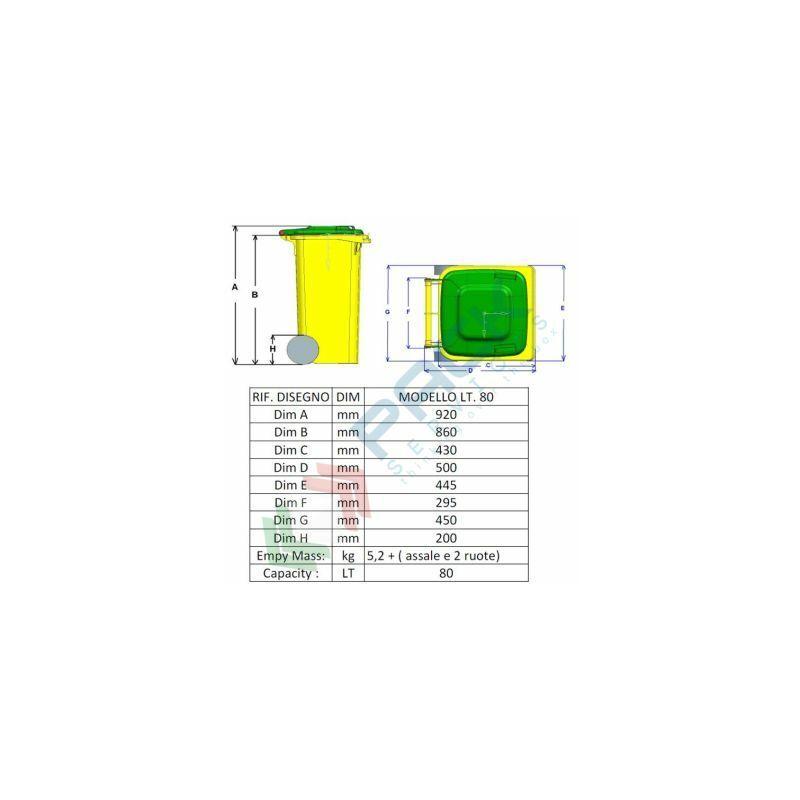 Bidoni immondizia in plastica ideali per la raccolta differenziata rifiuti e di materiali da recupero per il riciclo, capacità 360 Litri, Mis. 860 L x 625 P x 1120 H mm, capacità di carico 140 Kg Il cassonetto per la raccolta differenziata dispone di attacco a pettine per il sollevamento meccanico. 860 L x 625 P x 1120 H mm, capacità di carico 140 Kg. Bidone immondizia in plastica ideale per la raccolta differenziata rifiuti e di materiali da recupero per il riciclo, capacità 360 Litri, Mis. Il bidone è a norma UNI EN 840 (UNI 10571 e DIN 30740). Bidone 360 Litri Pattumiera Differenziata Mobil Plastic Bidone Carrellato Per La Raccolta Differenziata Rifiuti 360 Lt Per Uso Esterno - Fondo Grigio E Coperchio Giallo (Uni EN 840 Bidone Carrellato Per Rifiuti Bidoni Per Rifiuti Il bidone per rifiuti ha 2 ruote a naso in gomma piena 200 mm, assale in acciaio di qualità zincato elettroliticamente e coperchio incernierato a libro ribaltabile sul retro e dotato di due prese per il sollevamento.