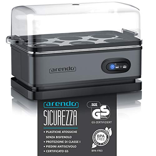 Bollitore Uova Sode Per 8 Uova, Acciaio Inox, Tempo Di Cottura Regolabile Adler Argento 800 AD 4486 85347164 Cuociuova Elettrico Regolatore di durezza: morbido, medio, rigido Pulsante di avviamento/arresto Cuociuova elettronico 6070 - Per fino a 7 uova. - Contenitore di cottura in acciaio inox . - Portauovo rimovibile. Inclusi 3 vaschette per uova - Avvolgicavo. - L = 18 cm x P = 21 cm x H = 15 cm. - 1, 1 kg, 220 240 Volt, 364 - 435 Watt Funzione di cottura: cuoce 3 livelli di cottura in un solo processo di cottura