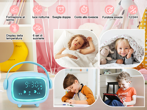 Mio figlio è molto attivo e potrebbe premere la sveglia. Cosa posso fare? Questa sveglia ha un modalità blocco bambino. 1 È TEMPO SVEGLIARSI 2 TEMPO DI DORMIRE La confezione include 1 orologio, 1 cavo di alimentazione USB e 1 manuale. Funziona con le batterie questa sveglia per bambini? No, deve essere collegata all'alimentazione (l'adattatore non è incluso). Il design a doppio allarme consente ai genitori di impostare diversi orari di sveglia per i giorni feriali e nei fine settimana per i bambini. C'è una batteria a bottone (inclusa) che salva le impostazioni in caso di interruzione di corrente. TEMPO DI DORMIRE Quando l'orologio dei bambini diventa rosso per indicare l'ora di andare a letto. Anche i prodotti per bambini possono essere belli! Design sofisticato La sveglia per bambini di Azyh è il dispositivo per dormire tutto in uno per il vostro bambino. È perfetta per compleanni, vacanze, baby shower e altro ancora! Ti risponderemo prontamente entro 24 ore e risolveremo il problema. Offre un controllo del volume regolabile, juntamente con la funzione di doppio allarme e l'opzione di snooze. Un tenue bagliore verde e il simbolo del sole segnalano al bambino che è ora di iniziare la giornata. Insegna ai bambini a capire meglio quando dormire e quando alzarsi e permette ai genitori di riposare di più. adoreranno le divertenti caratteristiche della sveglia con luce ambientale e apprezzerai la tranquillità sapendo che stanno ottenendo il resto di cui hanno bisogno. Offre 11 modalità di colore per creare un'atmosfera calda e accogliente in qualsiasi stanza, fungendo da luce notturna per mantenere i bambini senza paura al buio. Rispetto agli allarmi digitali, i simboli del sole e della luna offrono un modo divertente per i bambini di capire il concetto di tempo Sono disponibili in confezioni eleganti e faranno la gioia di genitori e bambini. Consente di impostare una routine della buonanotte, con la luce ambientale che si spegne automaticamente dopo un'ora per cullare i bambini a dormire. È TEMPO SVEGLIARSI Quando la sveglia diventa verde e indica che è ora di alzarsi, inizia la giornata! L'orologio per l'allenamento del sonno per bambini libera i genitori dalle notti irrequiete, favorisce l'indipendenza nei bambini e coltiva abitudini di sonno sane Non voglio doverla ricominciare da capo. Tenendo premuto il pulsante Tunes per 3 secondi si entra nel blocco bambino, durante il quale è possibile solo ascoltare la musica e regolare il colore della luce ambiente. RIMANERE A LETTO LEGGERI Compra Azyh Sveglia per Bambini, Sveglia Digitale con Luce Notturna a 11 RGB Colori, Sveglia per Ragazzi e Ragazze, Macchina del Suono del Sonno,Orologio per Comodino, Regalo, Snooze, 2 Allarmi, Cavo USB. SPEDIZIONE GRATUITA su ordini idonei È una scelta eccellente per il tuo bambino, nipote, nipote o figlio di un amico, perfetto come regalo di compleanno, regalo di Halloween o regalo di Natale. 【Orologio da allenamento con sole e luna】 alle 7 del mattino, quando il sole appare sullo schermo a LED, i bambini sanno che è ora di alzarsi e giocare. Sveglia Da Comodino YONGYAO Sveglia Luminosa Per Bambini, Sveglia Coniglio Bambina, Blu Con Funzione Snooze, 6 Suoni Forti, Luce Notturna Programmata, Ideale Come Regalo Per Bambini E Ragazze Sveglia Con Proiettore Soffitto 【Compagno di luce notturna per bambini】 questo orologio con luce ambientale per bambini dispone di illuminazione ambientale che può essere facilmente attivata con una leggera pressione sulla parte superiore. Una combinazione di simpatia e funzionalità per accompagnare il bambino La sveglia con luce ambientale per bambini è facile da usare e ricca di caratteristiche: regolazione della luminosità, regolazione del suono, funzione snooze, blocco bambini, interfaccia di uscita USB e altro ancora