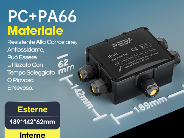 Scatola Giunzione Impermeabile Akozon Scatola Di Giunzione In Plastica IP68 T100 Per Cablaggio Di Collegamento Subacqueo, 450VAC 24A UL94V, Design Impermeabile E Facile Installazione Per La Sicurezza Della Scatola Di Distribuzione Impermeabile Fort Protection Questa scatola di connessione in plastica può essere utilizzata per le luci sottomarine e offre protezione della fontana. Buone prestazioni]: plastica bidirezionale impermeabile, antipolvere, resistente ai raggi UV, non sensibile all'umidità, può essere installata orizzontalmente e verticalmente come scatola di giunzione esterna IP68 Waterproof Questa scatola nera ha una buona funzione impermeabile a cui puoi essere sicuro. 【Buona protezione】 Questa scatola di giunzione in plastica può essere utilizzata per le luci subacquee e offre una buona protezione. 【Facile installare】 Questa scatola di giunzione è facile usare e installare, fa risparmiare tempo e fatica. 【IP68 impermeabile】 Questa scatola nera ha una buona funzione impermeabile, puoi assicurarla in sicurezza. Specifiche: Tipo di elemento: scatola di giunzione Materiale: plastica Tipo: 4 vie/5 vie/6 vie (opzionale) Capacità di cablaggio: 2Cx3C 0,5-2,5 MM² Tensione e corrente: 450 V 24 A Temperatura: T100 Intervallo di diametro del cavo per il montaggio: 5~9 mm/0,2~0,35 pollici 9~12 mm/0,35~0,47 pollici Profondità massima'acqua: 5 m di ignifugo: UL94V-2 dei pacchetti: 4 x anelli di tenuta 1 x terminale 6 x viti