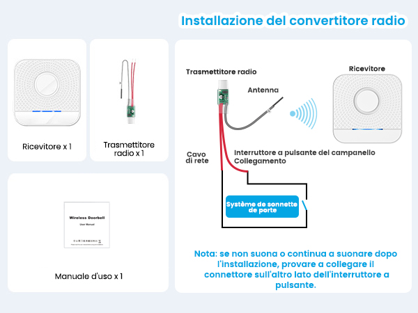 Il segnale wireless può trasmettersi in modo stabile entro un raggio di 100 m/328 ft, coprendo efficacemente casa/appartamento/giardino/tenuta. Apertura Citofono Da Remoto Satisure Doorbell Set Di Estensione Radio Per Campanelli Senza Fili 1 Convertitore Radio + 1 Presa Per Ricevitore Per Sistemi Di Campanelli Esistenti (trasmettitore Incorporato 3-24V AC/DC Citofono Universale Regala nuove esperienze alla tua vita! Kit anteroposteriore per porta Un ricevitore può essere installato su ogni porta anteriore e posteriore Satisure Doorbell Set di estensione radio per campanelli senza fili 1 convertitore radio + 1 presa per ricevitore per sistemi di campanelli esistenti (trasmettitore incorporato 3-24V AC/DC) 4,4 su 5 stelle 563 Trasforma il Campanello Cablato in Senza Fili: Aggiorna il tuo campanello cablato originale senza necessità di cablaggi. Due diverse suonerie Potete impostare suoni diversi per ogni ricevitore Descrizione prodotto SINGCALL Set di estensione radio per l'inoltro di campanelli senza fili Suonerie Multiple e Volume Regolabile: Ricevitore portatile con 32 suonerie e volume regolabile da 0 a 100 dB; Imposta suonerie diverse per ogni trasmettitore; Modalità silenziosa per evitare disturbi durante il sonno; Lampeggio LED abbinato alle suonerie Non occorre distinguere poli ± Un'installazione semplice garantisce un utilizzo comodo e immediato Quando il segnale del campanello viene inoltrato, il ricevitore non solo emetterà un segnale acustico, ma anche il LED lampeggerà. Potete selezionare il volume adatto da 0 a 100 dB per adattarvi a diversi ambienti d'uso. Il ricevitore memorizza il volume impostato (0-100 dB regolabile) e la suoneria selezionata tra 32 stili. Kit Base Aggiorna il sistema di campanello tradizionale a campanello wireless ricevitore portatile a LED Un convertitore supporta fino a 20 ricevitori simultaneamente Lunga portata: Garantisce una trasmissione stabile fino a 100 m/328 piedi in aree aperte;Ricevitore portatile con pannelli posteriori removibili,viti e nastro adesivo per installazione a parete o uso portatile;Design trasportabile per non perdere notifiche Sistema Wireless Espandibile: Supporta funzionamento simultaneo di più trasmettitori (porta anteriore/posteriore), espandibile fino a 20 unità; Numero di ricevitori configurabile in base all'area di utilizzo, adatto per case/appartamenti/giardini/ville