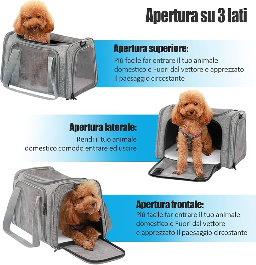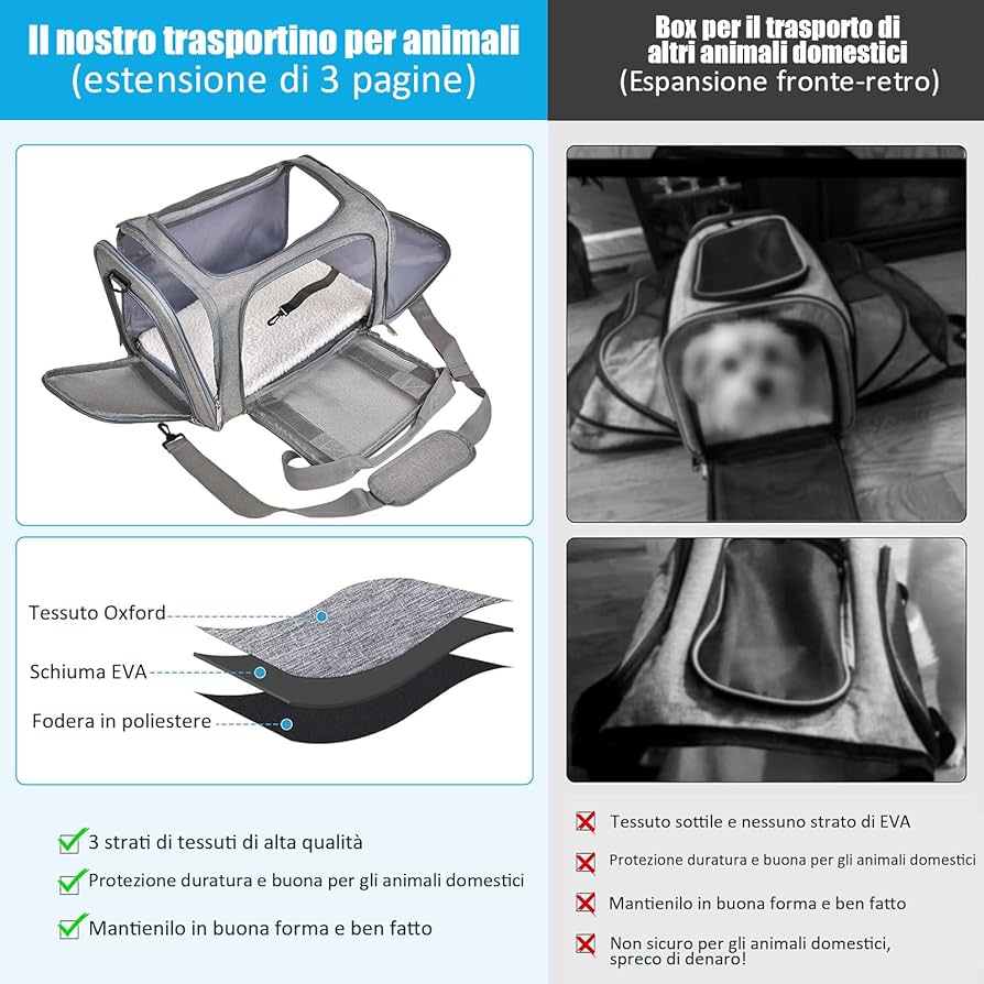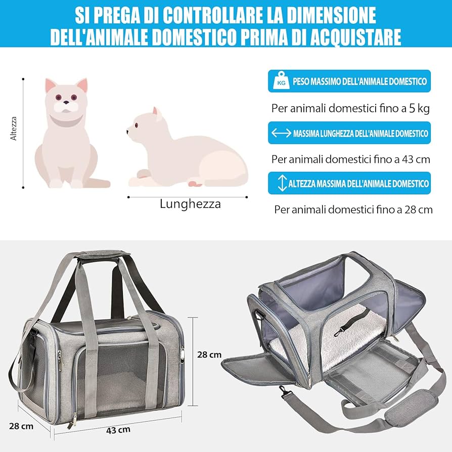 Trasportino gatto borsa pieghevole Nella trasportino per cani taglia grande è presente anche un morbido e caldo cuscino per animali, trasportino per cani può essere facilmente pulito quando l'animale perde pelo o sviluppa odori. Trasportino per cani 40x25x25 cm pieghevole morbido Borse da trasporto per gatti con materassino d'aria rimovibile Capacità ideale Meno di 6,5 kg Grigio Per trovare il trasportino per cani ideale, scegli quello della misura giusta per il tuo animale domestico. Migliora l'esperienza di viaggio del tuo animale La scatola giusta per il tuo animale domestico 【Robusto e sicuro】: il tessuto Oxford di alta qualità non è solo resistente ai graffi, ma anche ecologico, non tossico e inodore. 【Suggerimenti caldi】 Prima di acquistare un trasportino per cani taglia piccola, misura le dimensioni del busto del tuo animale domestico, come: altezza verticale (dalla testa al pavimento) e lunghezza (dalla punta del naso alla base della coda). 【Ingresso facile e ventilazione ottimale】: Il nostro trasportino per cani taglia media da viaggio ha 4 ingressi e uscite sulla parte superiore e sui lati, puoi facilmente far entrare e uscire i tuoi animali domestici e ci sono 5 finestre in rete traspirante, che non solo forniscono una vista migliore, ma Garantisci anche la sicurezza dei tuoi animali. Trasportino per cani taglia grande Il suo facile assemblaggio ti farà risparmiare tempo quando vorrai riutilizzarlo. Trasportino per cani taglia media questo design eccellente lo rende comodo da usare per te e il tuo animale domestico Trasportino Per Cani Omologato Reerooh Trasportino Per Cani E Gatti L 70x52x52cm, Viene Misure Trasportini Per Gatti 【Tanti accessori e facile da pulire】: Questo morbido trasportino per cani taglia grande viene fornito con due ciotole per animali, perfette per conservare cibo per cani o acqua, Quando non viene utilizzato, il trasportino per cani può essere ripiegato e riposto in macchina. Pertanto, i nostri trasportino per cani taglia piccola sono ideali per soggiorni sicuri a lungo termine. Trasportino per cani borsa pieghevole Reerooh TRASPORTINO PER CANI Crea un ambiente privo di stress dove possa connettersi con la natura e sentire la brezza esterna. I robusti tubi interni in acciaio inossidabile forniscono una stabilità senza precedenti e prevengono il collasso. Ciotola da Viaggio Pieghevole