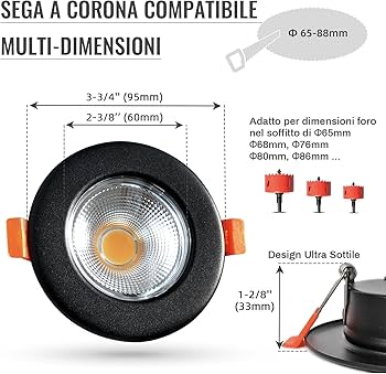 Si integrano perfettamente nel tuo design e sono la soluzione ideale di illuminazione per casa o ufficio. 【💡 Faretti LED da Incasso con Design Elegante in Nero Opaco】Questi faretti LED da incasso presentano un elegante design nero opaco, che garantisce durata e resistenza alla ruggine. 【💡 Faretti LED Soffitto ad Alta Intensità】Faretti LED da incasso per cartongesso da 95mm, 220V con design COB illuminano in bianco caldo (3000K) con 600LM, equivalenti a lampade alogene da 70W, con un alto CRI di 82+. 【💡 Faretto LED Interno dal Design Piatto】Questi faretti LED da incasso ultra piatti sono profondi solo 33 mm e hanno un diametro di 95 mm. Faretti LED Soffitto ad Alta Intensità]I faretti led soffitto da 95 mm con design COB illuminano con una luce neutro (4000K) e 600LM, equivalenti a lampade alogene da 70W, con un CRI alto di 82+. Il fascio stretto di 60° offre un'illuminazione mirata Questi faretti a LED offrono un'illuminazione eccellente e un design slanciato che non compromette le prestazioni. Richiedono aperture nel soffitto di Ø65-88 mm (ideale per seghe a tazza Ø65, Ø68, Ø76, Ø80 e Ø86 mm). Faretti Da Incasso Per Cartongesso FARETTI LED DA Incasso Per Cartongesso 5W Equivalenti A 50W 600LM Led 220v Questi faretti LED da 7W sono progettati per migliorare l'atmosfera in ogni stanza, creando un'atmosfera accogliente. Installazione semplice senza bisogno di un trasformatore. Goditi il comfort, l'efficienza energetica e l'impatto estetico di questi faretti a soffitto. 【💡 Faretti LED da Incasso per Cartongesso Delicati e Amichevoli per gli Occhi】A differenza delle tradizionali lenti in vetro e dei faretti GU10 a singolo raggio, i nostri faretti LED da incasso per cartongesso emettono una luce soffice, senza abbagliamenti, e luminosa grazie alle lenti riflettenti di alta qualità da 60°, proteggendo i tuoi occhi e migliorando l'esperienza di illuminazione. Con Ø65-88 mm di diametro, questi faretti a incasso LED da 230V si adattano perfettamente alle aperture standard del soffitto. Aggiorna la tua illuminazione con i nostri faretti a incasso e trasforma il tuo spazio in un luogo elegante e ben illuminato. In solo 4 passaggi, potrete apprezzare i vantaggi di questi faretti ultra sottili.