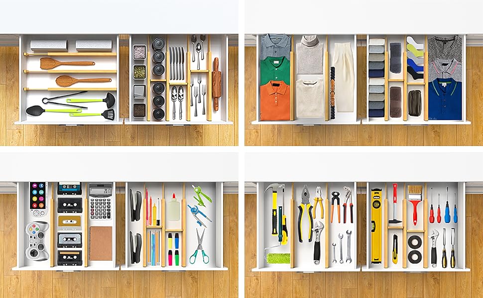 Cassetta Per Attrezzi 2PCS Divisori Per Cassetti,Separatori Per Cassetti In Plastica Cassetta Attrezzi Espandibile: con una lunghezza regolabile da 43 cm a 56 cm, questi divisori sono perfetti per la maggior parte dei cassetti, rendendoli una soluzione versatile e multiuso. Separatore per cassetti regolabile in bamb ù: ogni organizer per cassetti dispone di una molla integrata per tenerli in posizione e consentire un facile adattamento alle vostre esigenze. I separatori per cassetti sono regolabili in lunghezza da 43 cm a 56 Questi divisori rendono facile mantenere i tuoi effetti personali ordinati e accessibili. Facile da installare: installare i nostri divisori in bambù è un gioco da ragazzi, basta farli scorrere in posizione e il gioco è fatto. Acquista il tuo oggi e sperimenta i vantaggi di una casa organizzata! Sono perfetti per qualsiasi stanza della tua casa. Multiuso: che tu stia conservando utensili, vestiti o strumenti, i nostri divisori in bambù sono pronti per la sfida.