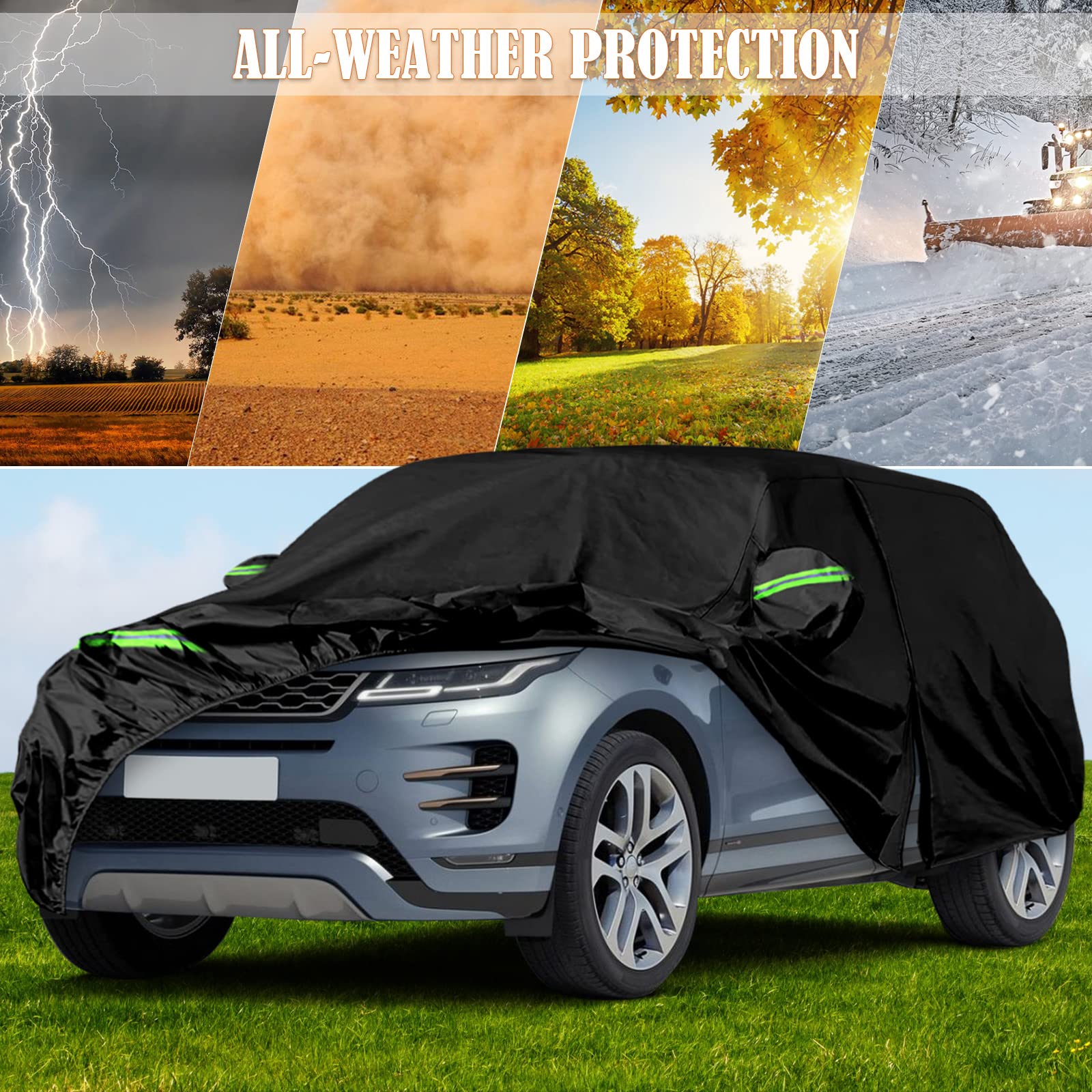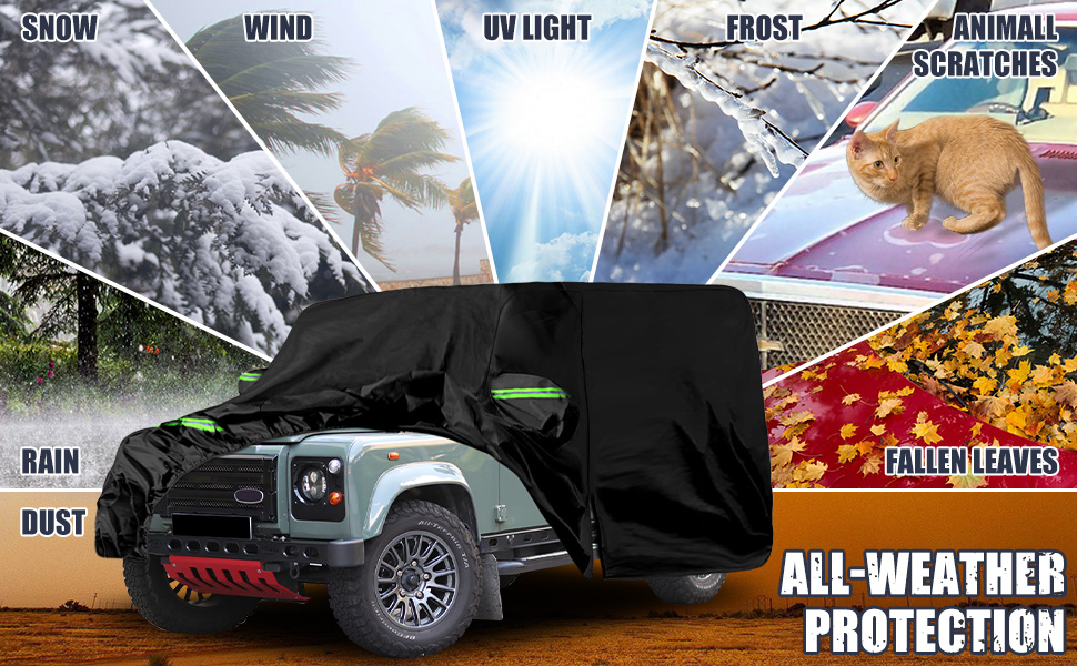 Telo NEWFUN Telo Auto Esterno Per Land Rover Defender 110 1990-2016 Copriauto Antigrandine 【MODELLI COMPATIBILI】Telo Auto Esterno per Land Rover Defender 110 1990-2016.Si prega di confermare il modello prima dell'acquisto. I nostri copriauto sono realizzati in tessuto 210D di alta qualità per mantenere la vostra auto sicura e protetta. Adatti per gli interni e per tutti gli elementi esterni. Protegge dalla neve in inverno e mantiene freschi in estate.I nostri teli copriauto Ci sono anche strisce riflettenti notturne sulla superficie del cofano, si può facilmente vedere il profilo dell'auto per evitare incidenti di notte. La squisita tecnologia a doppia cucitura rende il telo auto più resistente e il telo auto è dotato di una serratura per proteggere meglio la vostra auto. 【FACILE DA USARE E DA CONSERVARE】questa telo copri auto per esterno è leggera e sottile, quando viene utilizzata direttamente sull'auto, è molto comoda e può affrontare tutti i tipi di tempo piovoso all'esterno; quando non viene utilizzata, può essere piegata e conservata, pulita e ordinata. 【Robusto e antivento】 il bordo elasticizzato della telo copri auto per esterno può adattarsi perfettamente alla vostra auto, e la cinghia di fissaggio inferiore + la cinghia antivento è doppiamente fissata, mantenendo la vostra auto in posizione anche nelle giornate ventose. 【Buona protezione】 questa telo copri auto per esterno è realizzata in materiale di alta qualità, protezione solare, isolamento termico, evita le alte temperature, previene l'invecchiamento degli interni dell'auto; previene gli inquinanti ambientali come la resina degli alberi e gli escrementi degli uccelli, previene lo sbiadimento, i raggi UV del sole, la neve, la polvere e la corrosione del vento.