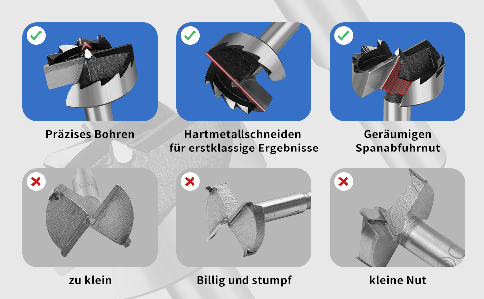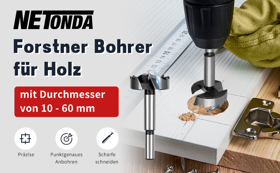 Con la punta di centraggio può essere fissata esattamente alla marcatura per posizionare il trapano nel miglior modo possibile. NOTA: prestare attenzione alla pre-foratura e al numero di giri durante la foratura! Punta Forstner dentata: la punta professionale Forstner dispone di 2 tagli principali ed è inoltre dotata di bordo periferico a denti che consente un taglio libero ottimizzato e un avanzamento più veloce nel foro. Taglio principale bloccato e levigato per un rapido avanzamento della foratura. Comodo da trasportare e riporre Per garantire che le punte non arrugginiscano, vengono confezionate singolarmente in sacchetti di plastica e trattate con olio. Il trapano non deve funzionare a caldo. Disponibile in diverse misure: Diametro del foro da Ø 10 mm a 60 mm. Attacco: codolo cilindrico. Ideale per tutti i trapani e trapani. Pertanto, iniziare sempre con una bassa velocità di rotazione e aumentarla anche lentamente. Maggiore è il diametro, più lontano è necessario correggere la velocità verso il basso. Meno è di più. Utilizzo: Foratura di fori ciechi/fori ciechi per il fissaggio di cerniere, ulteriori raccordi, tasselli o rimozione di fori per rami. Fondamentalmente si applica: Funziona a una velocità inferiore rispetto a un trapano elicoidale. Il bordo dentato impedisce la ricottura dei tagli Taglio temprato: Per un'affilatura costante di lunga durata. Si consiglia di utilizzare un trapano a terra, in modo da poter regolare al meglio la pressione. NETONDA Forstner - Punta per legno da 10 mm, diametro 10 mm, per trapano Forstner con codolo rotondo, per forare fori ciechi, multitaglio · 10mm. 7,32 €7,32 Taglio preciso: grazie alla punta di centraggio autocentrante di alta qualità, questa punta Forstner consente un posizionamento preciso e stabile durante il funzionamento, senza scivolare o oscillare. Punta di centraggio per una foratura facile e precisa, impedisce che si sposti su superfici lisce. Fresa Legno Punta Forstner Per Legno Da 40 Mm, Punte Forstner Professionali HPHOPE Punte Per Legno Forstner La corretta velocità di rotazione è importante durante la foratura con la punta Forstner. Consigli: Per le specie di legno duro, è necessario aumentare la pressione sul trapano. Gli ampi alloggiamenti per trucioli contribuiscono alla facile rimozione dei trucioli di legno. Grandi zone senza filamenti per un trasporto ottimizzato dei trucioli e precisione di foratura rapida Descrizione prodotto NETONDA - Punta Forstner con codolo rotondo, per legno Le punte Forstner multi-taglio tagliano più velocemente, aggressiva e pulita rispetto a tutte le altre punte Forstner in legno tenero o legno duro. Ciò faciliterà la perforazione e i risultati saranno più accurati.