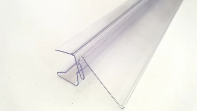 PVC con fondo porta etichette trasparente o bianco, ad incastro, per ripiano in cristallo con spessore da 8 a 10 mm. Taglio profilo su misura con consegna dello sfrido. Porta etichetta (trasparente e bianco). Dim. 4x100 cm (HxLunghezza max Adatti a farmacie, profumerie, supermercati, negozi Dimensione 100x1,8h cm. Confezione da 50 pezzi. In PVC trasparente, inserimento dell'etichetta frontale. Lungo 100 cm. Per ripiani spessore 6-10 mm Profili Per Ripiani In Farmacia Portaprezzo Basculante “PC-DRA” 30 Per Ripiani In Filo | Profilo Porta Reglette Portaprezzi Profili porta-prezzi per ripiani ad incastro In PVC trasparente