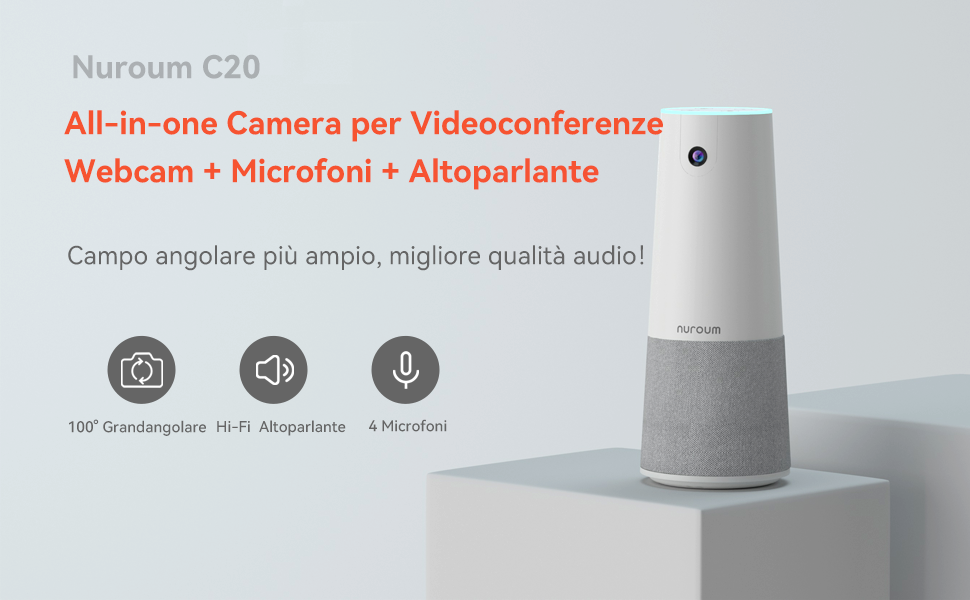 Il telecomando e i pulsanti superiori offrono comode opzioni per spegnere la videocamera e disattivare i microfoni. Inoltre, la telecamera offre una capacità di zoom fino a 5x, consentendo agli utenti di concentrarsi sui dettagli essenziali con il controllo remoto. Con Microfono Nuroum C40 Webcam Per Videoconferenze Con Altoparlante E Microfono, Zoom 5x/Pickup Vocale Da 5m Webcam Pc Webcam all-in-one per sale conferenze: Il sistema di videoconferenza NEARITY C45 combina una telecamera ultra-grandangolare da 120° con un sensore CMOS premium da 5MP, in grado di fornire immagini 2K@30fps e 1080p@60fps. L'array di microfoni omnidirezionali a 4 elementi, potenziato dalla tecnologia a rete neurale compressa, sopprime i rumori di fondo, cancella gli echi e mette in risalto le voci, fornendo un suono senza distorsioni anche in scenari ad alto volume. L'applicazione NearSync facilita gli aggiornamenti del firmware e consente la regolazione personalizzata di impostazioni quali i parametri audio, la luminosità e la saturazione dell'immagine. La NEARITY C45 2K è una webcam progettata per migliorare l'esperienza delle videoconferenze, con caratteristiche avanzate come l'altoparlante integrato, il microfono con cancellazione del rumore, il FHD 5X Zoom e l'AI Auto-Framing Dotato di 4 microfoni AI a cancellazione del rumore e di un altoparlante premium ad alta fedeltà, garantisce una chiarezza video e audio di alta qualità per riunioni, presentazioni e discussioni online, adatte ai team aziendali. Altoparlante ottimizzato integrato e microfoni a riduzione del rumore: Dotata di un altoparlante full-duplex ottimizzato, la telecamera per computer garantisce una comunicazione chiara per un massimo di 15 partecipanti offline nel raggio di 15 metri dalla base. L'anello luminoso rotondo visualizza lo stato in tempo reale, assicurando che la privacy dell'utente sia sempre sotto controllo.