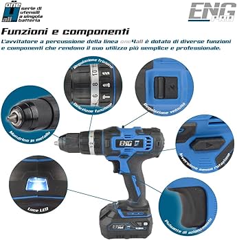L’avvitatore a percussione ENG PRO ha una coppia di serraggio massima di 40 Nm, raggiunge la velocità di 1500 rpm ed un tasso di impatto di 21000 bpm. Il vantaggio dell’acquisto del trapano avvitatore a percussione ENG PRO con 2 batterie consiste nel poterle alternare nel momento in cui una delle due esaurisca il ciclo di carica. Trapano Avvitatore Batteria Avvitatore A Percussione - Linea Professionale ONE4ALL 20V - 1 Batteria 2 0ah 88833127 Trapano Avvitatore A Batteria L’avvitatore a percussione ENG PRO è un membro della linea ONE4ALL, la nuova linea di elettroutensili ad unica batteria. Inoltre, sono inclusi un caricabatteria che permette di ricaricare una batteria da 2.0Ah in 1 ora. L’impugnatura ergonomica permette di mantenerlo saldamente, la luce LED permette di illuminare i punti più bui e la ghiera di selezione della funzione e frizione rendono possibile scegliere come utilizzare l’utensile (avvitatore, trapano o trapano a percussione) ed a che coppia di serraggio. TRAPANO AVVITATORE A PERCUSSIONE 20V Doppia velocit à Velocità massima: 400/ 1500 rpm Frequenza massima colpi 22500/min Torsione: 45 Nm Capacità mandrino : 0,8-10 mm Coppia di serraggio: 18+1+1 posizioni Funzione blocco mandrino Mandrino autoserrante in m Lo scopo di questa nuova linea è quello di consentire l’utilizzo di vari utensili acquistando una sola ed unica batteria 20V, compatibile con tutti gli altri membri. In questa configurazione, sono incluse 2 batterie ONE4ALL dalla capacità di 2.0Ah e 4.0Ah. Inoltre è equipaggiato da un robusto mandrino autoserrante in acciaio dalla capacità massima di 13 mm.
