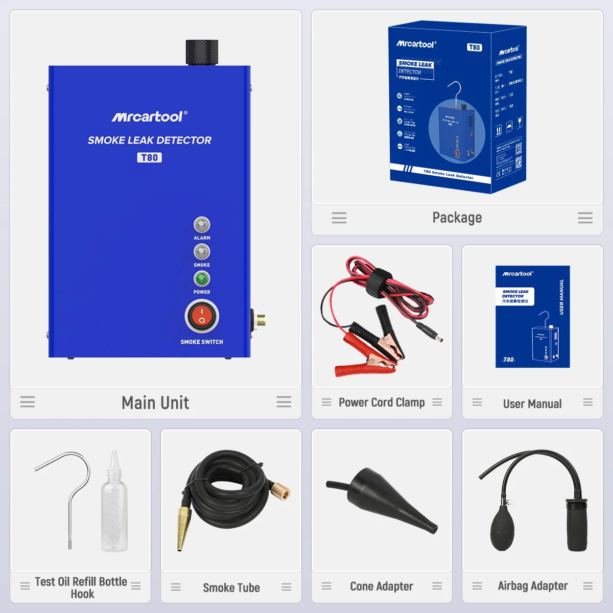 Quando temperatura interna raggiunge 75°C, smette di funzionare automaticamente per garantire un funzionamento sicuro e affidabile. 【Funzionamento Semplice e Protezione Surriscaldamento】Questo rilevatore fumo è dotato un indicatore livello e un interruttore controllo fumo, facile da usare e comodo da monitorare e controllare durante il processo rilevamento delle perdite. Pulizia Fap PLAYOCCAR 12V Rivelatore Perdite Fumo EVAP Pompa Incorporata Ghiaccio Secco Per Effetto Fumo 【Elenco Confezioni】T80 Unità principale*1, Tubo di fumo*1, Morsetto per cavo di alimentazione*1, Bottiglia di ricarica dell'olio di prova*1, Adattatore a cono*1, Adattatore per airbag*1, Gancio*1, Manuale d'uso*1. 【Note e Post-vendita】 Troppo olio di prova nella macchina influisce sulla produzione di fumo, si prega di invertire il prodotto per scaricare un po' di olio di prova. Inoltre, forniamo un supporto post-vendita completo, se avete qualsiasi richiesta, non esitate a contattarci, vi risponderemo al più presto entro 24 ore. Il rilevatore è dotato una protezione contro il surriscaldamento. Se il prodotto non viene utilizzato per un lungo periodo, si consiglia di scaricare e conservare l'olio di prova rimanente. 【Ampia Applicazione】 È adatto a tutti i tipi di veicoli, tra cui auto, moto, camion, SUV, motoscafi e così via.