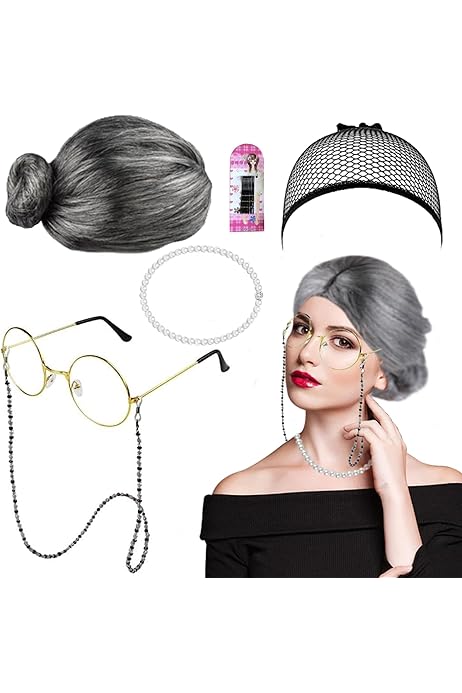 MIVAIUN 5 Pezzi Granny Vecchia Signora Accessorio, Parrucca Nonna Costume Accessorio, Set Cosplay Della Nonna Parrucca, Grigio Nonna Parrucca