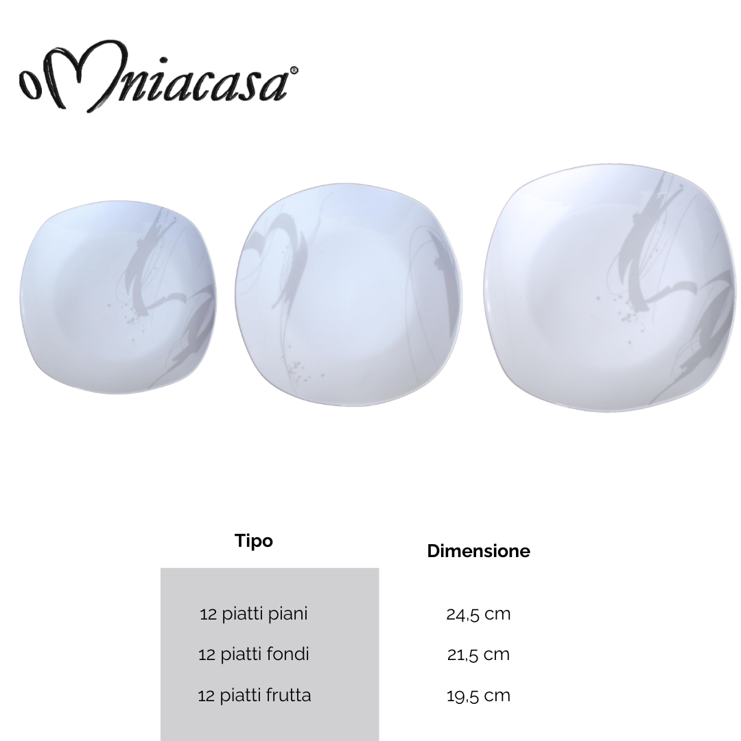 Piatti Moderni Piatti Da Tavola E Portata Bianchi Con Lavabile In Lavastoviglie Tognana Piatti Questo elegante servizio di piatti in ceramica bianca cattura l'attenzione con il suo design a effetto inchiostro in bianco e grigio. Design unico: Questo servizio di piatti presenta un design a effetto ink bianco e grigio per un tocco di eleganza e stile sulla tua tavola Interamente lavabili in lavastoviglie, questi piatti vi permetteranno di portare in tavola un tocco di stile unico. Composizione: Il set comprende 6 piatti piani (24,5 cm), 6 piatti fondi (21,5 cm) e 6 piatti da frutta (19,5 cm) per soddisfare tutte le tue esigenze. Versatilità: Questo set di piatti si adatta perfettamente a diverse occasioni, dall'uso quotidiano a cene più formali. Design unico: Questo servizio di piatti presenta un design a effetto ink bianco e grigio per un tocco di eleganza e stile sulla tua tavola. Perfetti per ogni occasione, dall'uso quotidiano alle cene di gala, questo servizio di piatti vi conquisterà con la sua bellezza senza tempo.