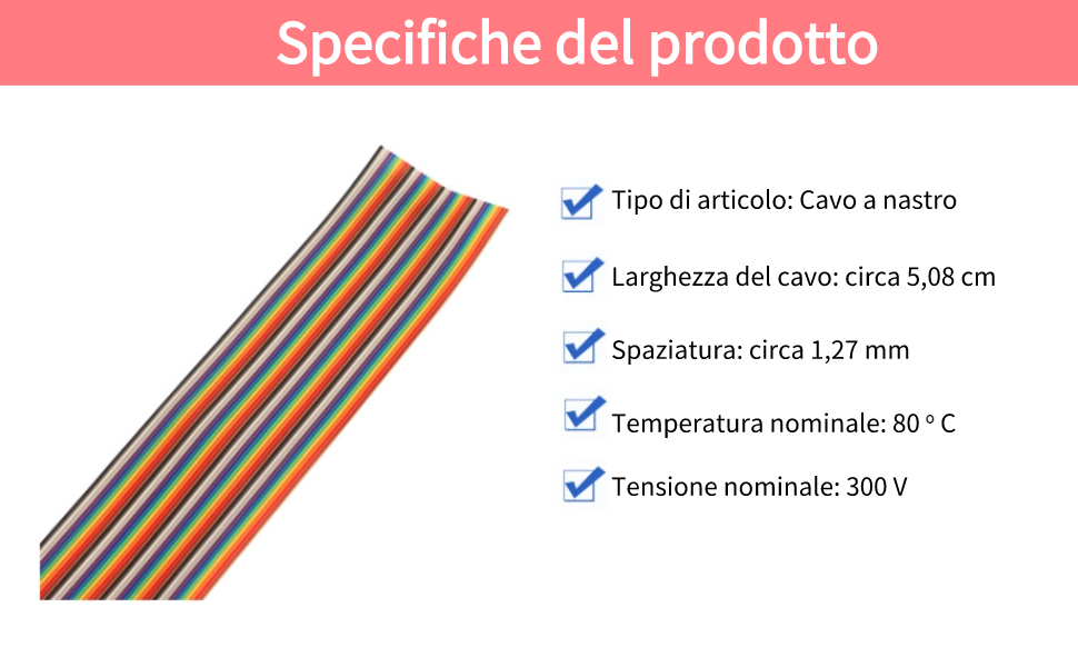 Creative Cables Aexit Cavi Piatti Flessibili FFC Da 16mm, Lunghezza 1mm, Passo 16 Piedini, 100 Pz ID: 910883 Nastro Arcobaleno APPLICAZIONE:1. Perfetto per progetti elettronici e può essere utilizzato per collegare diversi componenti.2. Elettronica fai-da-te, progetti di hobby, prototipazione e altro ancora, come sensori, motori, luci LED.VANTAGGI:1. Realizzato con materiali di qualità che garantiscono durata e affidabilità.2. Facile da usare e installare. Le migliori offerte per DMiotech 1pz 8 Perni Piatto IDC Arcobaleno Fiocco Cavo 300cm 1.27mm Passo S sono su Confronta prezzi e caratteristiche di prodotti nuovi e usati Molti articoli con consegna gratis CONTENUTO DELLA CONFEZIONE:Nella confezione: 1 Confezione di Cavo a Nastro PiattoNumero di Pin: 20PLunghezza: 148cm;Larghezza totale: 25mm;Passo dei pin: 2.54mmNOTA:1. Assicurarsi di abbinare correttamente il pinout per evitare danni all'elettronica.2. Quando si utilizza questo prodotto, maneggiarlo con cura. FUNZIONE: Fornisce una connessione affidabile tra i componenti e altri dispositivi. Offre un'eccellente performance e può essere utilizzato in una varietà di applicazioni elettroniche. Numero di Pin: 20P; Lunghezza: 148cm; Larghezza totale: 25mm; Passo dei pin: 2.54mm; Nella confezione: 1 Confezione di Cavo a Nastro Piatto; APPLICAZIONE: Adatto per una vasta gamma di applicazioni, inclusa l'elettronica fai-da-te, progetti di hobby, prototipazione e altro ancora, come sensori, motori, luci LED.
