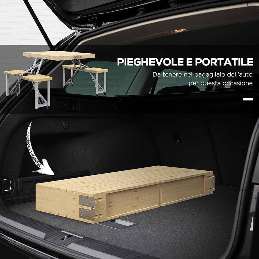 Outsunny ti accompagna nelle gite all'aperto con questo pratico tavolo da pic nic con sgabelli integrati, per pranzi e momenti di relax in compagnia. Il design pieghevole assicura di ridurre l'ingombro della struttura, per trasportarla facilmente e riporla in poco spazio Capacità di peso: 30 kg (tavolo), 110 kg (sgabello). STRUTTURA DUREVOLE: Realizzato con un telaio in alluminio leggero ma rinforzato e un piano in legno resistente e facile da pulire, questo set da picnic offre grande stabilità e praticità. MONTAGGIO VELOCE: Grazie alla struttura integrata di tavolo e sgabelli, il set da picnic può essere assemblato rapidamente e senza complicazioni. Dimensioni piegato: 90L x 41P x 10A cm. Tavolo Pieghevole Da Esterno Outsunny Tavolino Da Campeggio Pieghevole Portatile Di Alluminio E Plastica Con 4 Sedie - Azzurri | Acquisti Online Su EBay Sedia Pieghevole Campeggio DIMENSIONI: Dimensioni del tavolo: 85.5L x 72.5P x 67A cm.